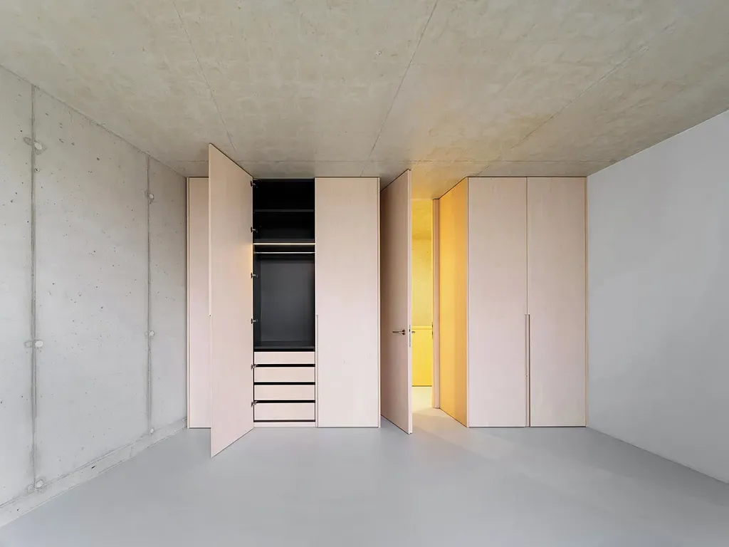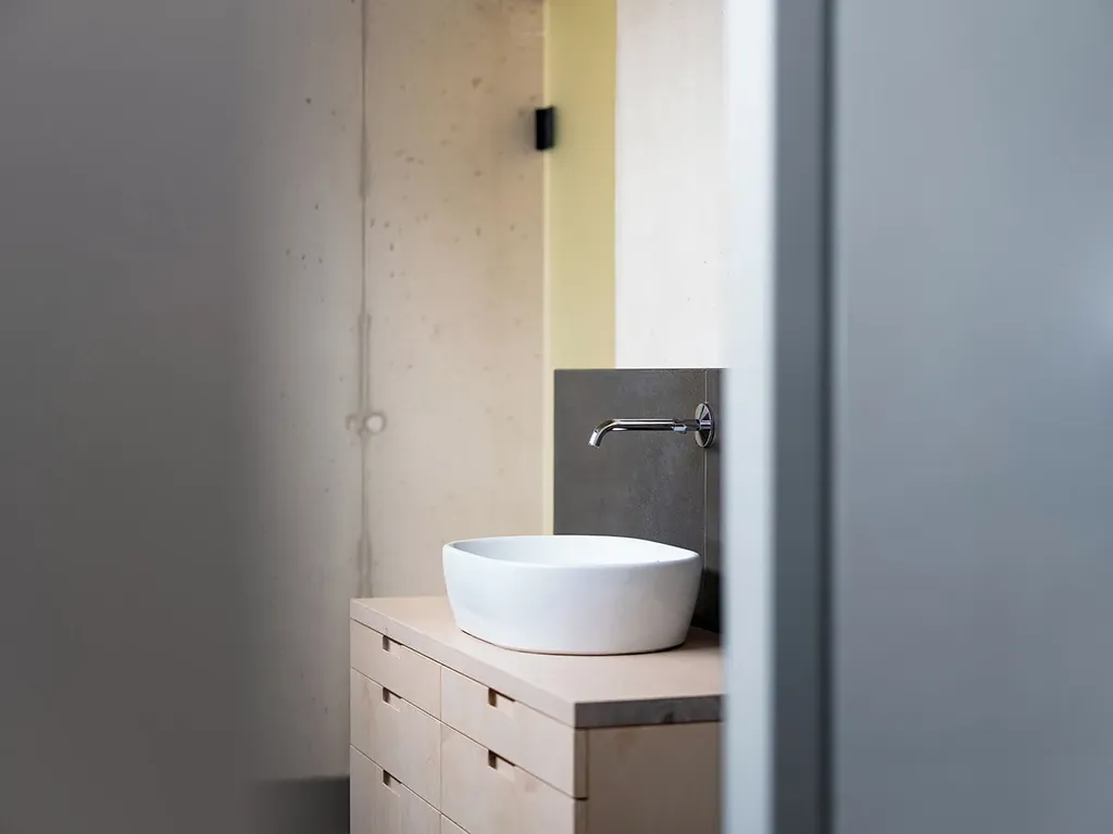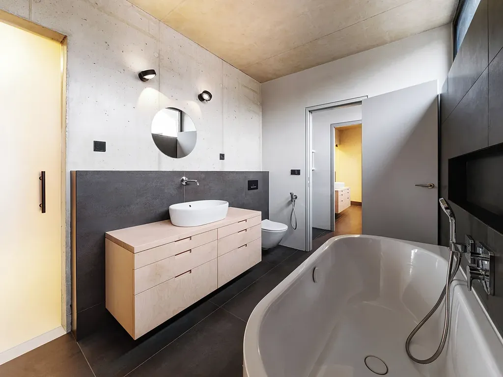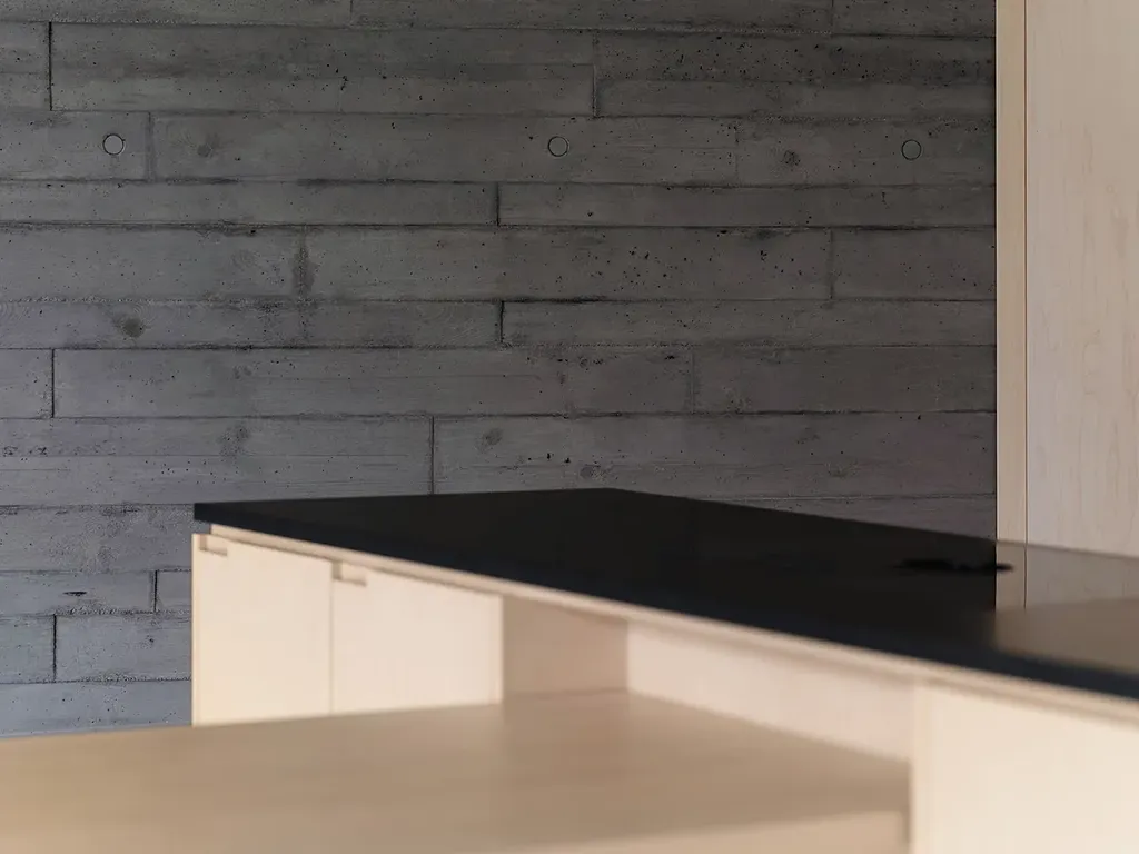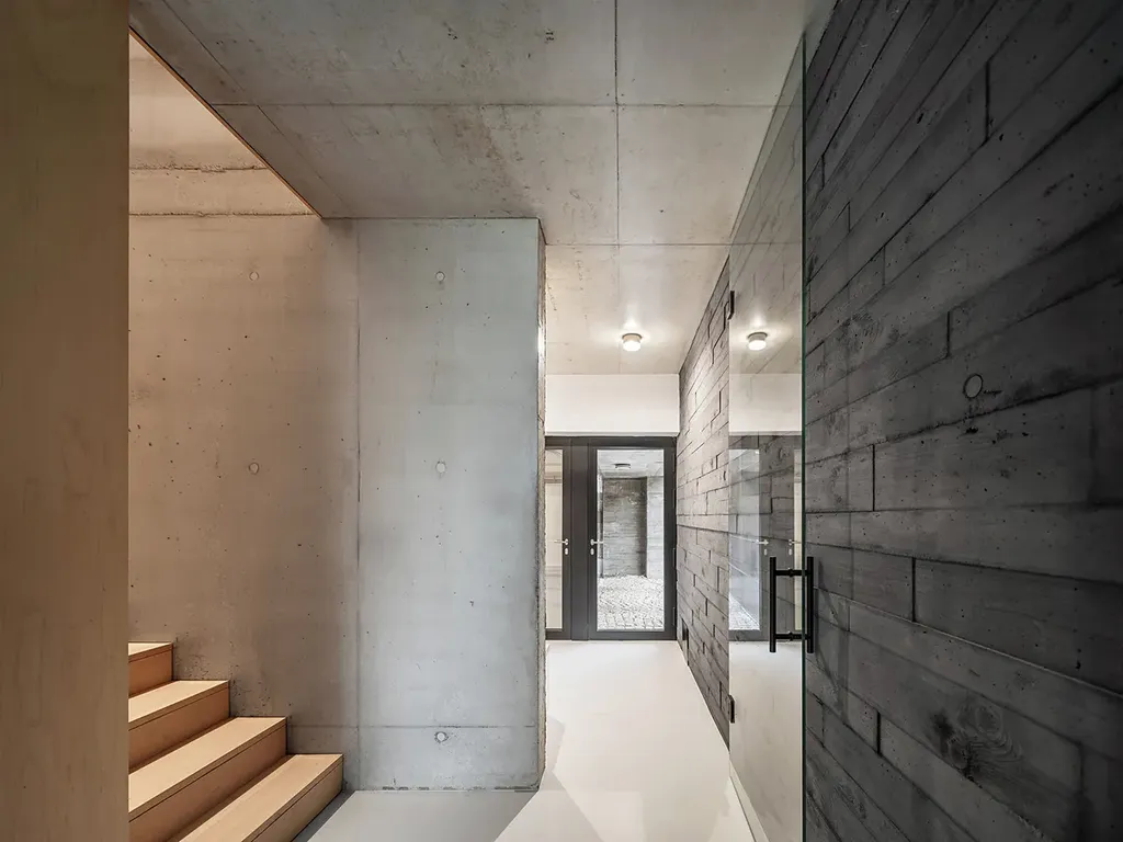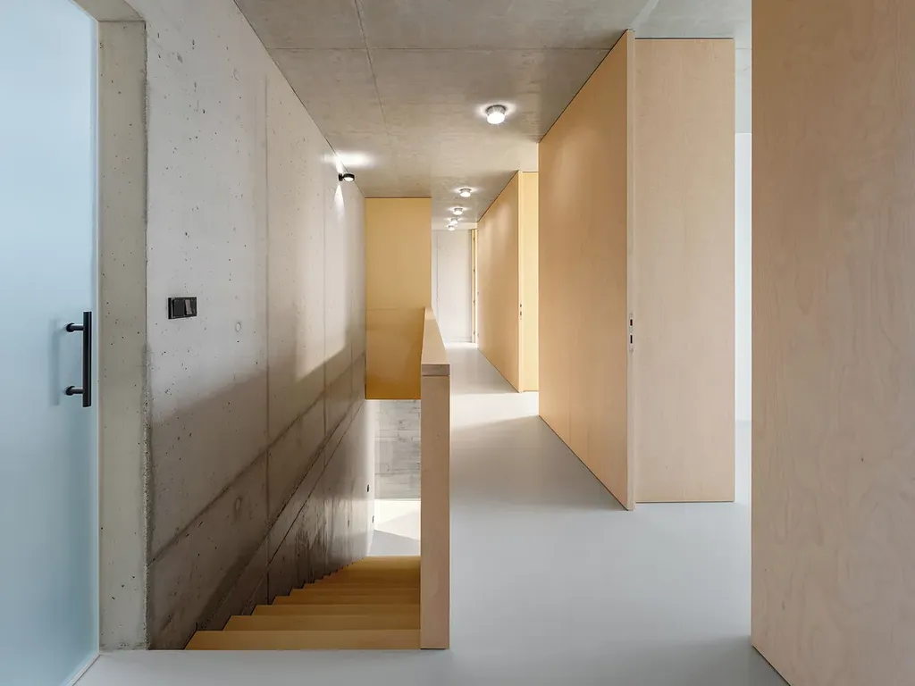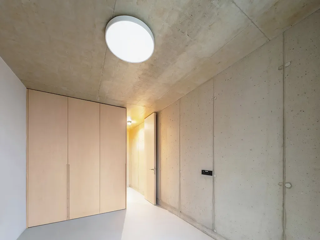 Materiálově je interiér vyvážený. Pohledový beton dává prostoru pevnost a klid; dřevo a vestavby z březové dýhy ho změkčují a dělají ho příjemným pro každodenní život. Nepůsobí studeně ani přezdobeně. Je to prostředí, které vás nebude unavovat a které si bez problémů vezme váš vlastní styl. Bezfalcové dveře, podlahové vytápění, tepelné čerpadlo a energetická třída B odpovídají standardu, který u takového domu očekáváte.