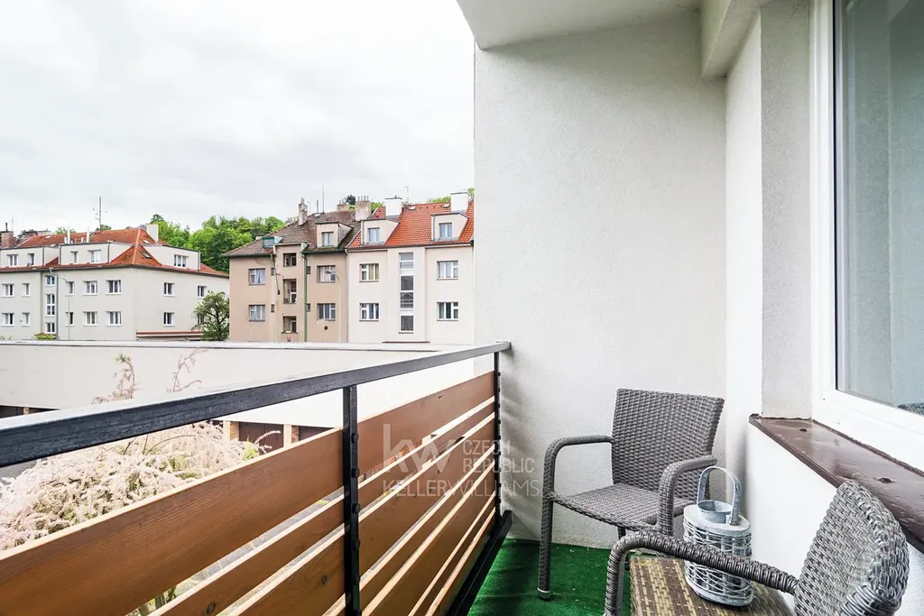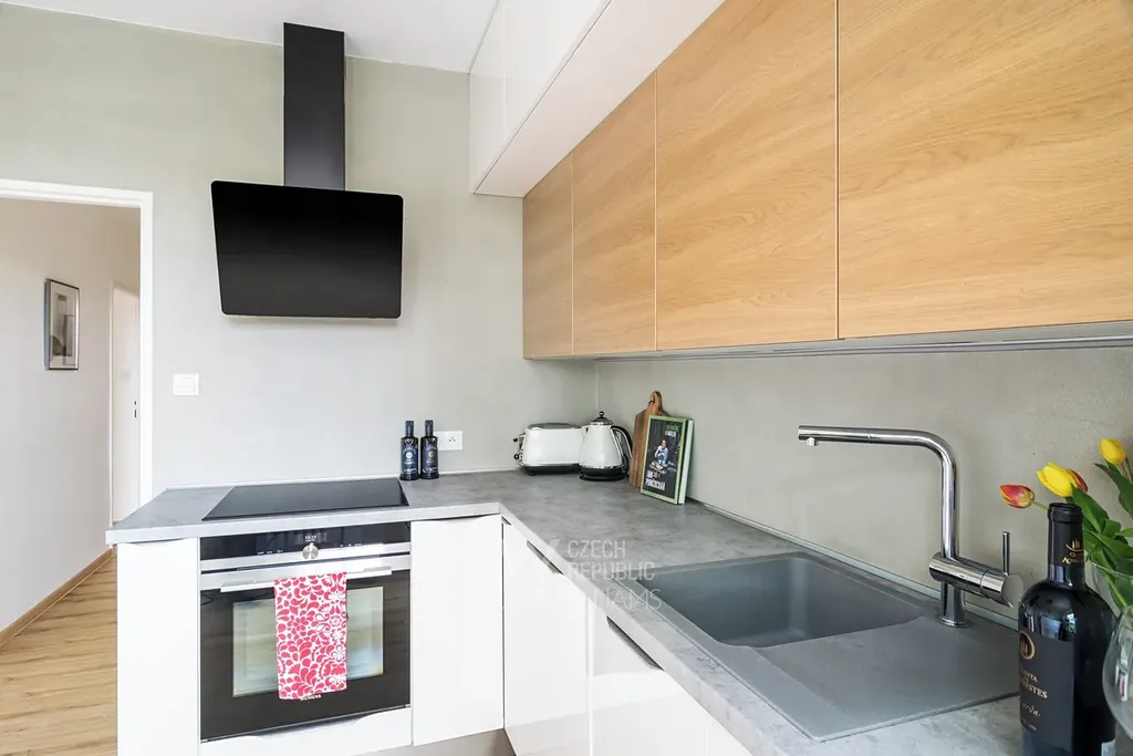 Kuchyně ve vysokém standardu je vybavena indukční deskou Siemens, troubou s mikrovlnkou Siemens, digestoří a dřezem Franke, pračkou se sušičkou Hoover, myčkou Siemens, ledničkou AEG a samostatnou kuchyňskou komodou. Z kuchyně je výhled do zeleně a přilehlé vilové čtvrti. Útulná koupelna se sprchovým koutem a elektrickým žebříkem na sušení ručníků. V bytě je samostatné WC. Teplo je zajištěno ústředním topením s kotelnou v domě, pro teplou vodu je v bytě nový 80l boiler. Nájemníci mohou též využívat sklep, kočárkárnu a sušárnu.