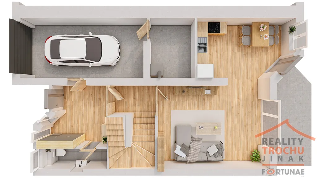 1.NP – zádveří, chodba, schodiště, obývací pokoj, kuchyň s jídelnou, samostatné WC, garáž (13,7m2), technická místnost (5 m2), východ na terasu (10,5m2) a zahradu.
