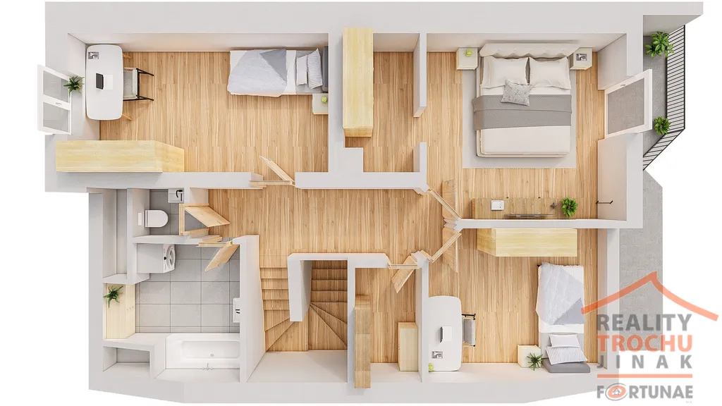 2.NP – chodba, 3x ložnice, koupelna s vanou, samostatné WC, 2x šatna, balkón (1,8 m2)