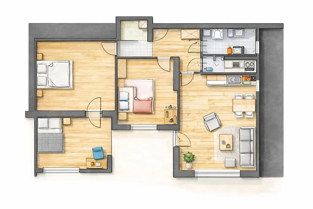 Dispozice bytu zahrnuje praktickou vstupní chodbu se šatnou, prostorný obývací pokoj s moderním kuchyňským koutem vybaveným spotřebiči, tři útulné ložnice (z nichž jedna je průchozí), koupelnu s vanou a samostatné WC. K bytu dále náleží opravdu velkorysý sklep, který poskytuje dostatek úložného prostoru.