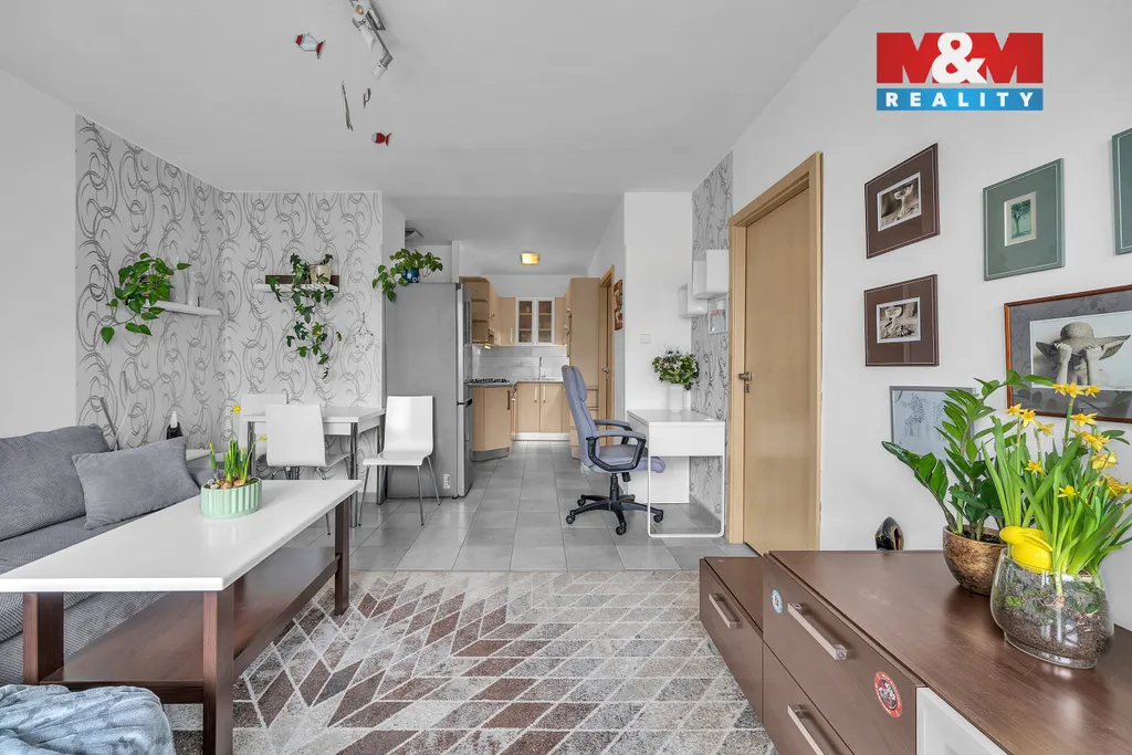 Dispozice bytu je velmi praktická. Kuchyňská linka ve tvaru U navazuje na obývací prostor a poskytuje dostatek pracovního i úložného místa.