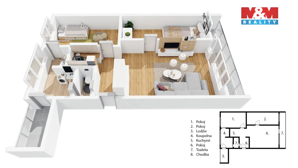 Velkou výhodou bytu jsou dvě zasklené lodžie. První lodžie vede podél obývacího pokoje a ložnice, druhá je rovněž zasklená a je přístupná z koupelny, která tak nabízí i příjemné denní světlo.