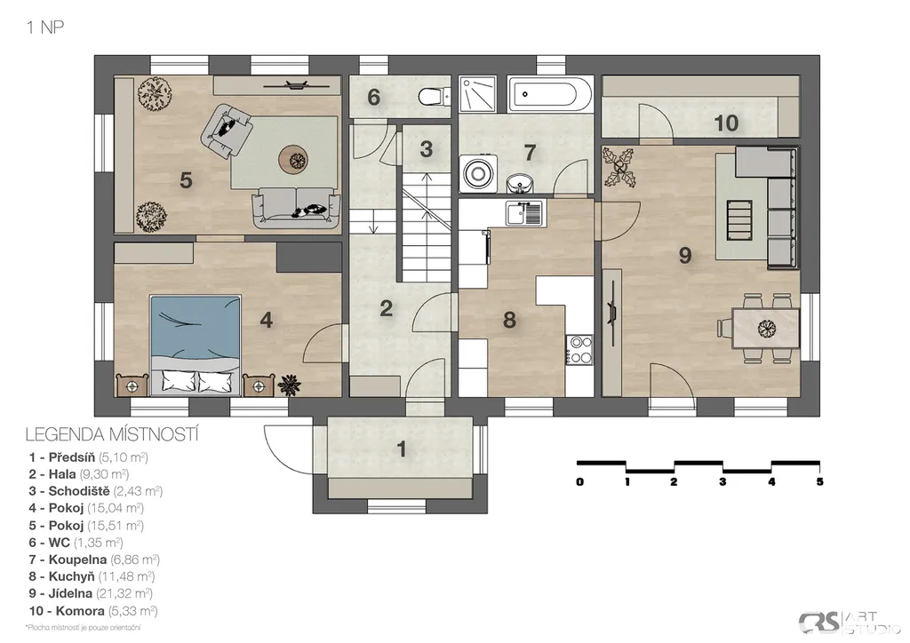 Skládá se z pěti pokojů, kuchyně, koupelny s vanou a sprchovým koutem, samostatné toalety a spíže.