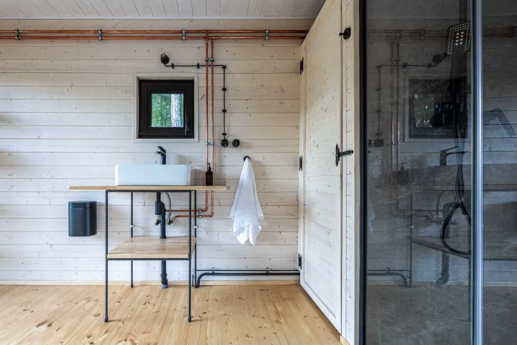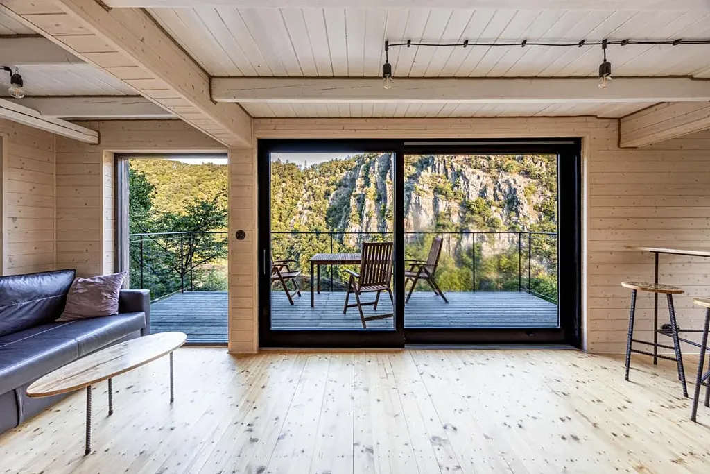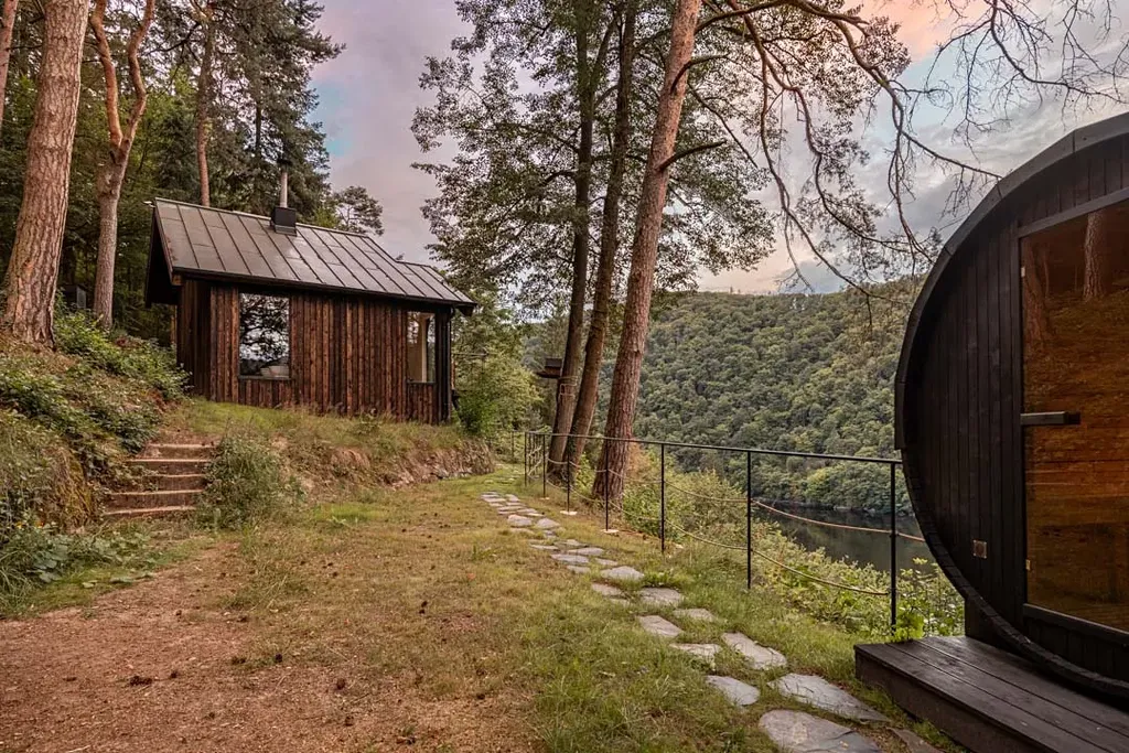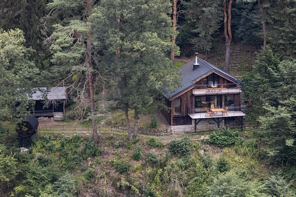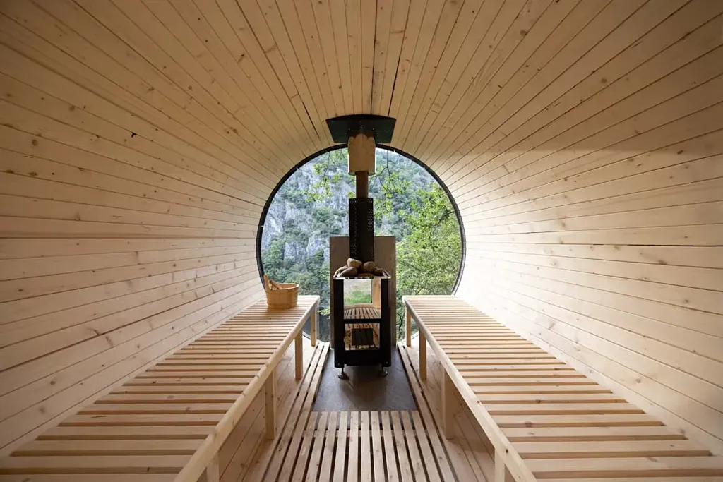 Součástí nemovitosti je soukromá sudová sauna s kruhovým oknem s přímým výhledem na skalní stěny — kamna na dřevo, lavice pro 4 osoby.