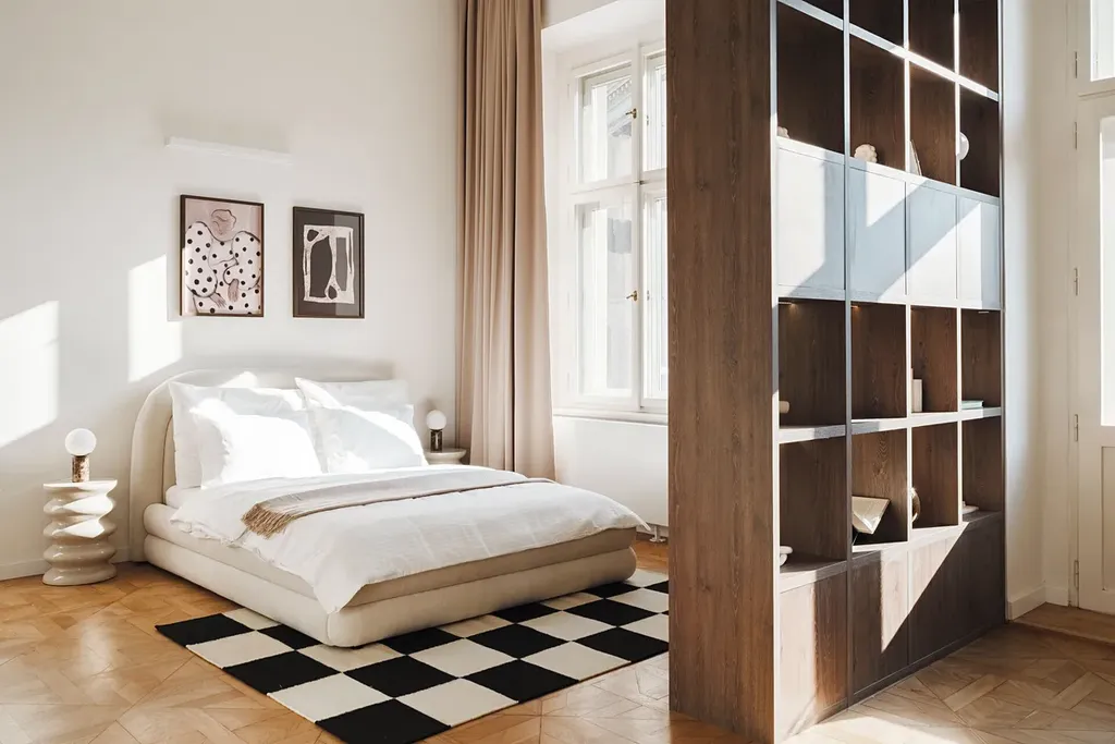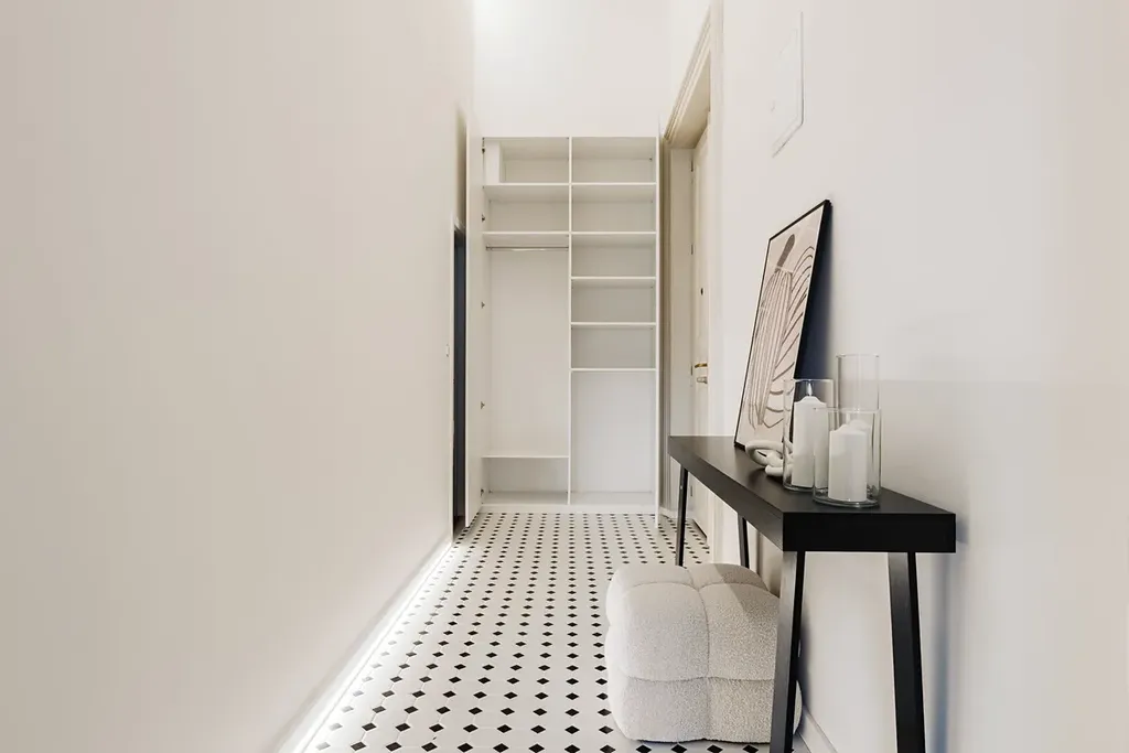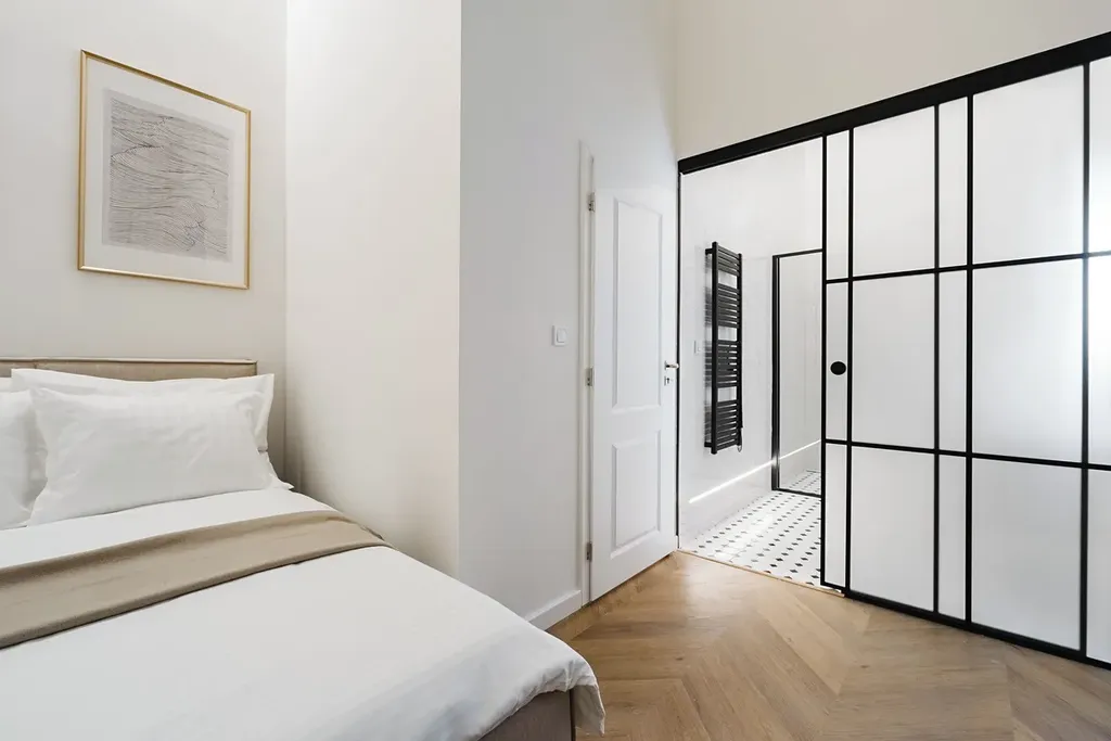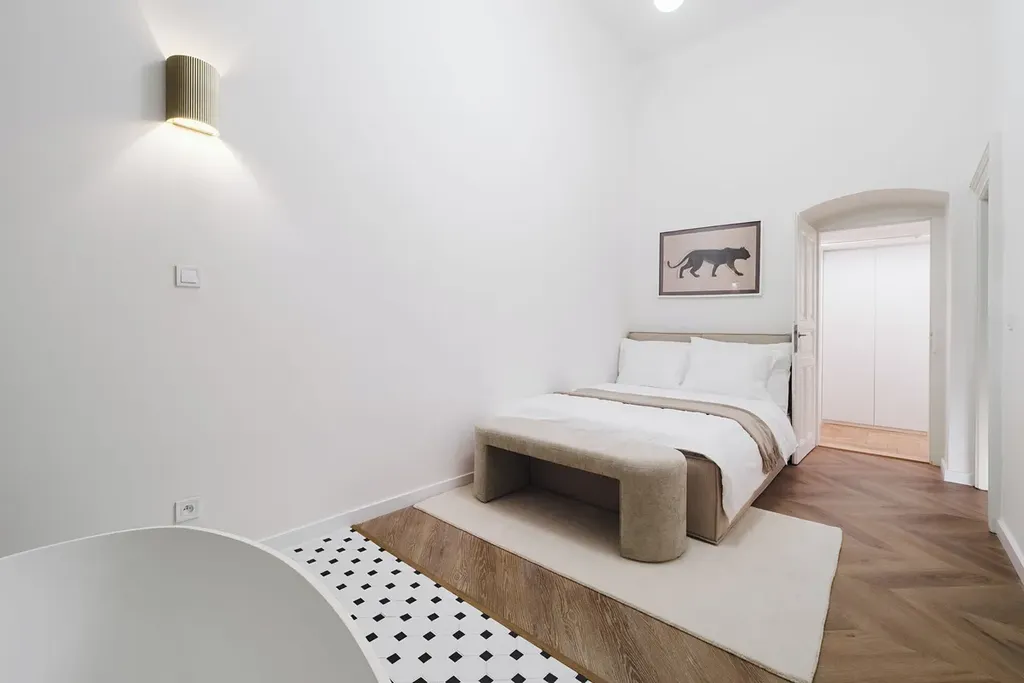 Dispozice bytu nabízí čtyři samostatné ložnice, tři moderní koupelny a prostorný obývací prostor s kuchyňským koutem, který je plně vybaven všemi spotřebiči. Součástí bytu je kvalitní nábytek, high-tech vybavení a dostatek úložných prostor. Velká okna zajišťují dostatek světla a zároveň poskytují jedinečný výhled na historické centrum Prahy a budovu Národního muzea.