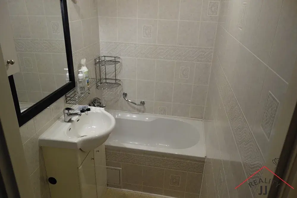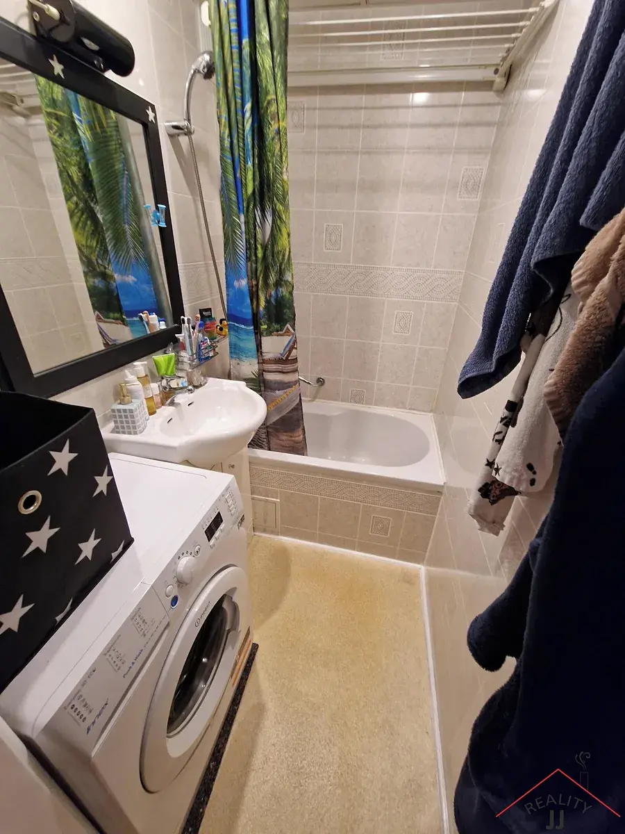 Byt po kompletní rekonstrukci je skutečně ve výborném stavu. Skládá se z chodby, obývacího pokoje s kuchyňským koutem, ložnice a koupelny a samostatného WC. Kuchyňská linka je vybavena sklokeramickou varnou deskou, digestoří, mikrovlnnou troubou a lednicí s mrazákem. Vybavení zahrnuje pouze šatní skříně v ložnici; velká šatní skříň, botník a věšák v předsíni,prádelník v obývacím pokoji. Ostatní vybavení dle dohody. V koupelně je umyvadlo se skříňkou,pračka , vana. Nové rozvody elektro, vinylové podlahy,el.žaluzie. Sklep-komora se nachází v mezipatře-5.NP.