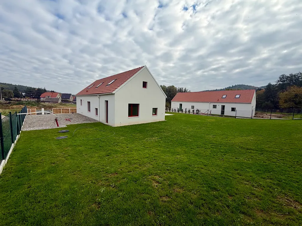 Nabízíme k prodeji moderní novostavbu rodinného domu ve tvaru L o dispozici 4KK s obytnou plochou 128 m² a obytně využitelným půdním prostorem 44 m² (možnost rozšíření na 5-6KK).