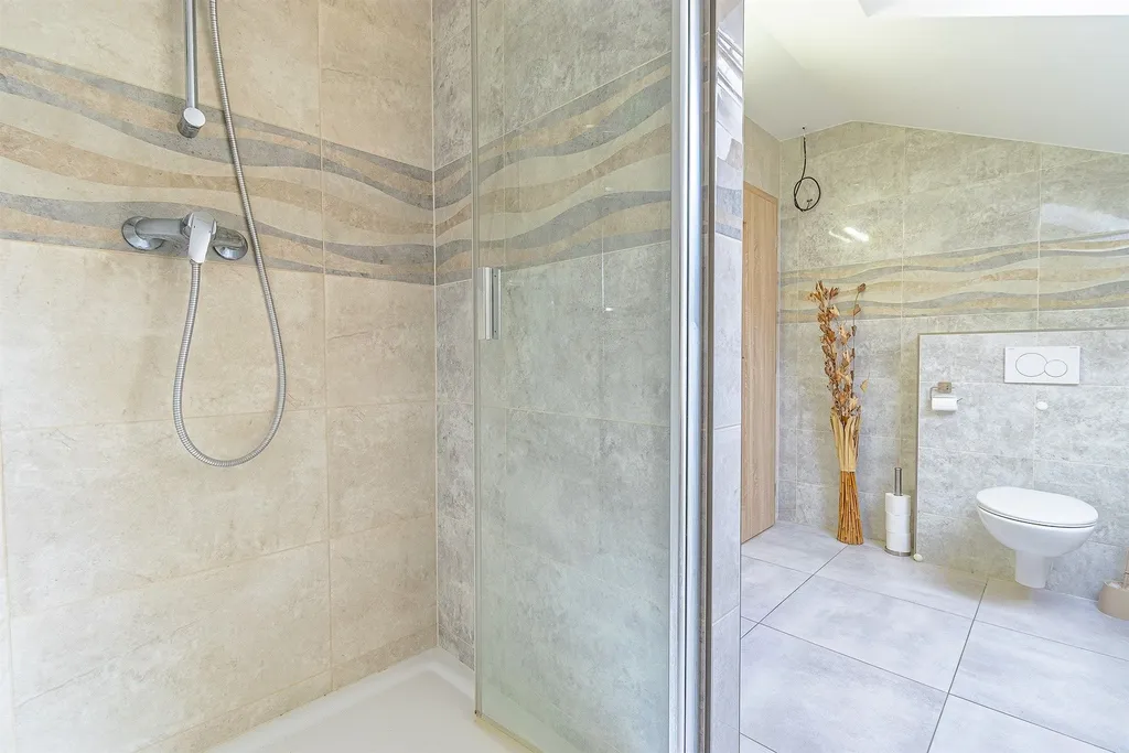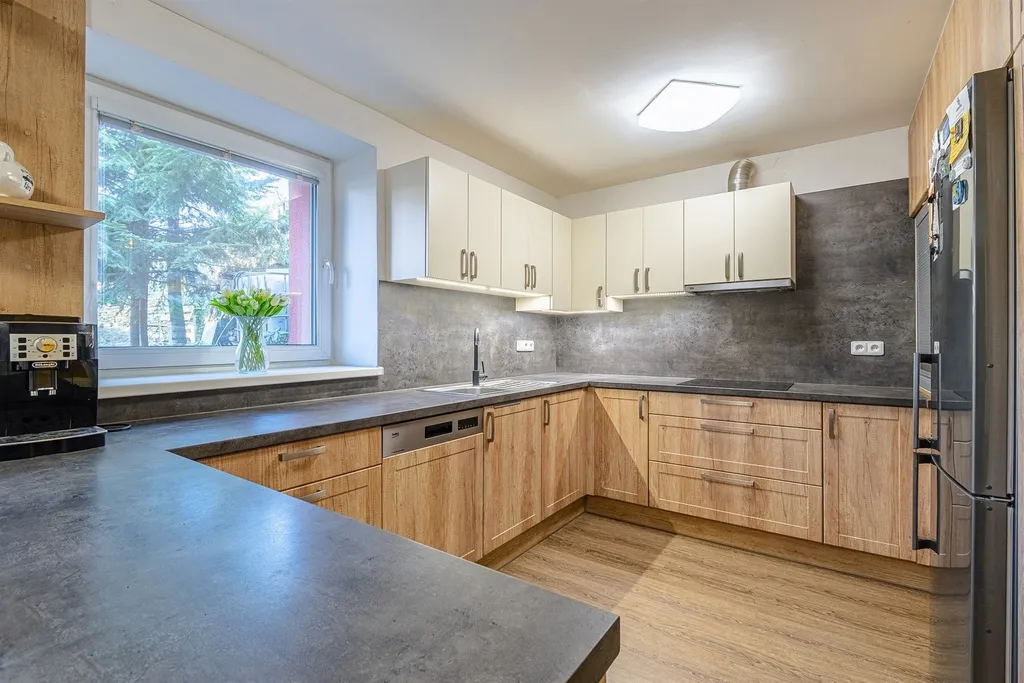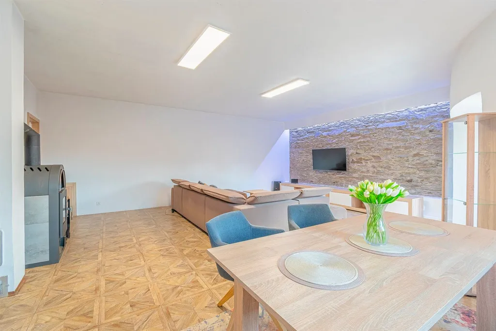Dispozice: vstup zádveří chodba kuchyně s jídelním koutem spodní koupelna se sprch. koutem a prostorem pro pračku obrovský obývací pokoj s výstupem přes portál na dvůr/zahradu technická místnost (kotel, zásobník, bojler, expanzka) WC samostatné schodiště do patra. V patře 3 pokoje (jeden průchozí) prostorná koupelna s vanou, sprchovým koutem a s WC.