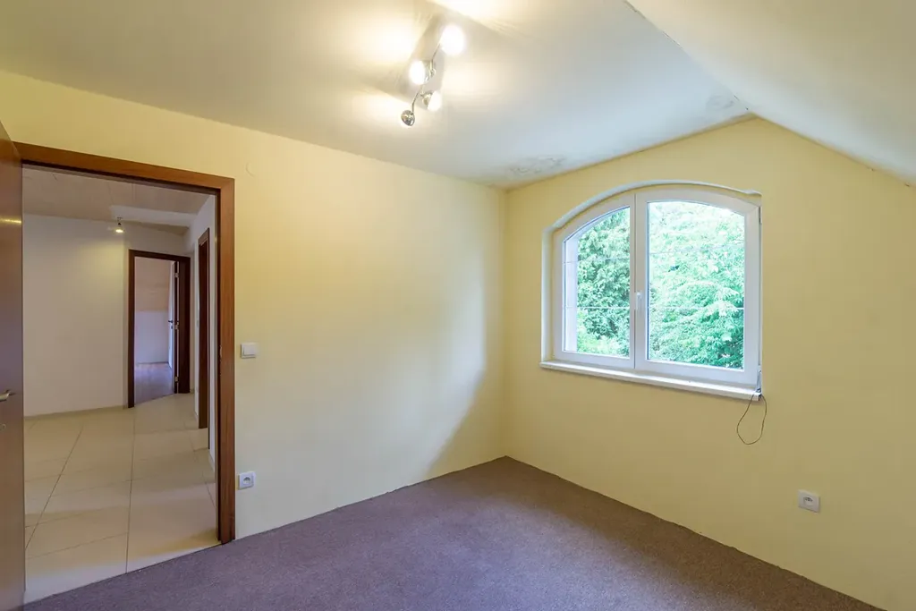 nadzemním podlaží je vstupní hala (13,6 m2) a hlavní obytný prostor - nalezneme tu velkorysý prostor tvořený obývacím pokojem (44,2 m2), na něj navazující jídelnou (33,3 m2) a kuchyní (12,1 m2), která je oddělena barovým pultem. Celý prostor je velmi vzdušný a otevřený směrem na jihovýchod do zahrady, dojem životního prostoru umocňuje vysoký strop zasahující až ke galerii ve druhém nadzemním podlaží. Prostory ještě doplňuje prostorný balkon (10,2 m2). Vyjma hlavní obývají části v nižším patře nalezneme ještě koupelnu s vanou (10,8 m2), samostatné WC (1,9 m2) a tři útulné pokoje/ ložnice (17,4 + 15,6 + 10,4 m2). Prostory ve vyšším patře tvoří galerie (33,6 m2), balkon (5,2 m2) a původní technická část/ půda (45,2 m2), která může být přetvořena na další obytné prostory.