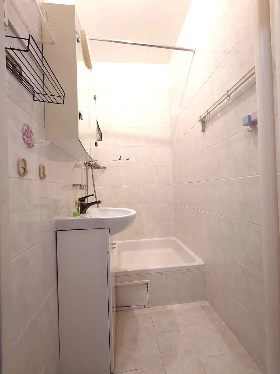 V chodbě je vestavěná skříň, v lince je umístěna pračka, malá lednice.