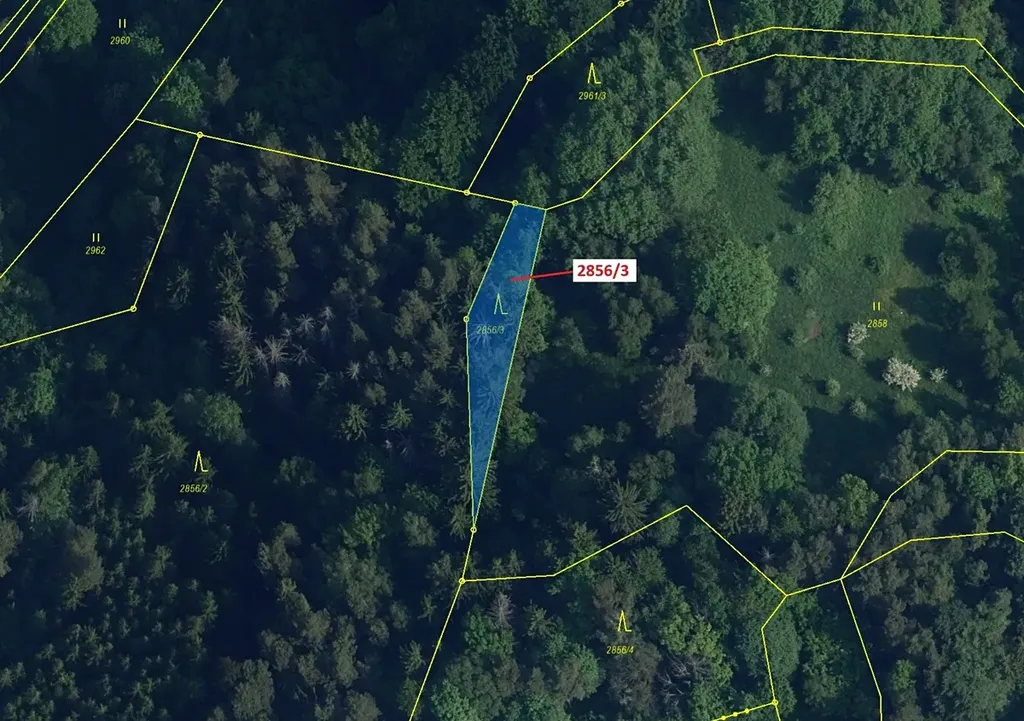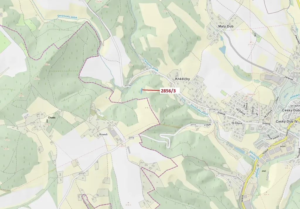 Lesní pozemek o výměře 448 m2, parcelní číslo 2856/3, podíl 1/1, katastrální území Český Dub, obec Český Dub, obec s rozšířenou působností Liberec, okres Liberec, Liberecký kraj. Po těžbě.