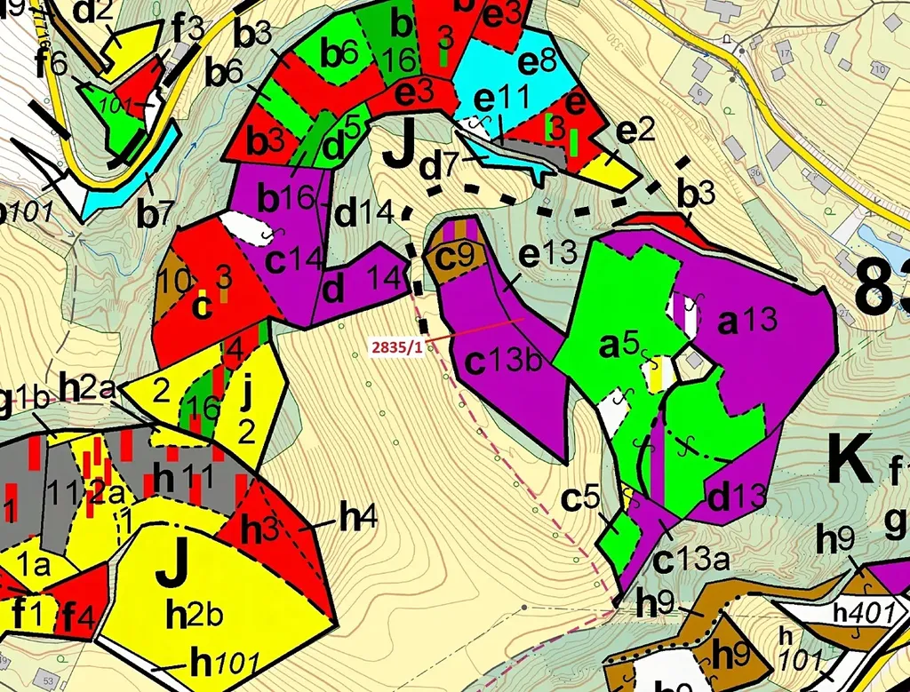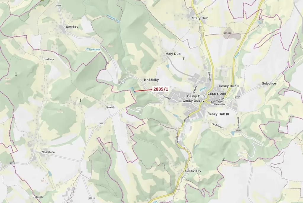 Lesní pozemek o výměře 2117 m2, parcelní číslo 2835/1, podíl 1/1, katastrální území Český Dub, obec Český Dub, obec s rozšířenou působností Liberec, okres Liberec, Liberecký kraj. Po těžbě.