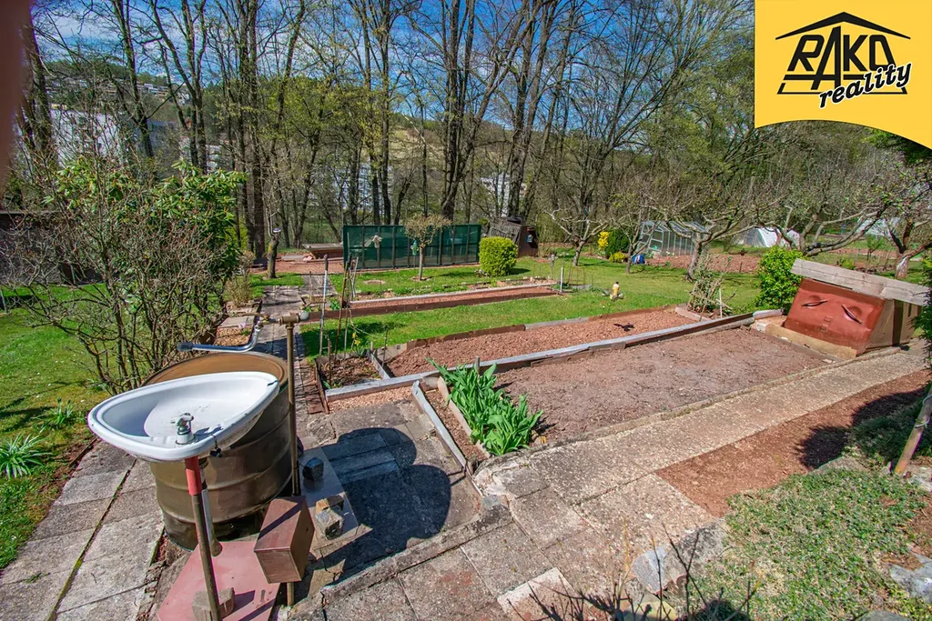 Chatu obklopuje mírně svažitý pozemek, kde je možné pěstovat ovoce, zeleninu, keře, stromy nebo je zde možné mít umístěný skleník. Ve spodní části pozemku je dřevěná kolna na nářadí.