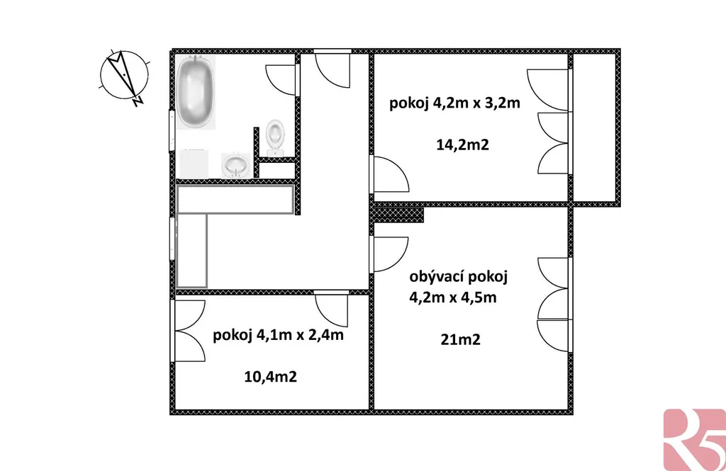 Obývací pokoj má 21m2, ložnice kde je vstup na balkon 2,6m2 má 14,2m2 a pokoj má rozlohu 10,4m2.