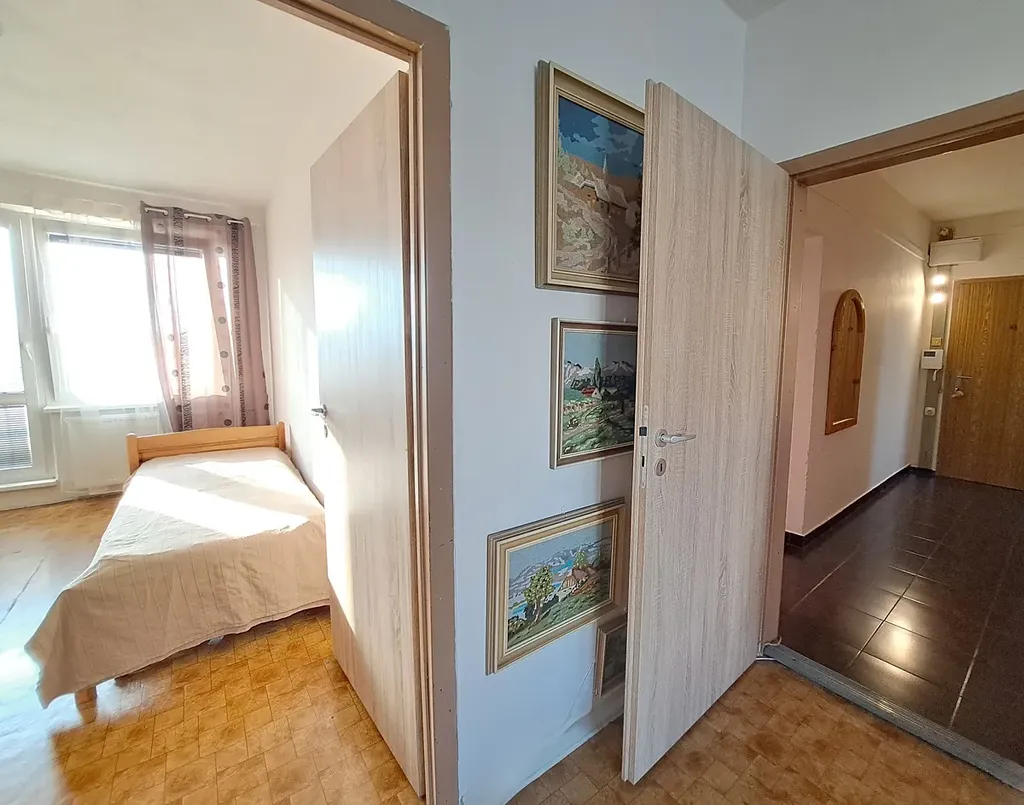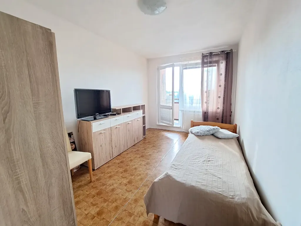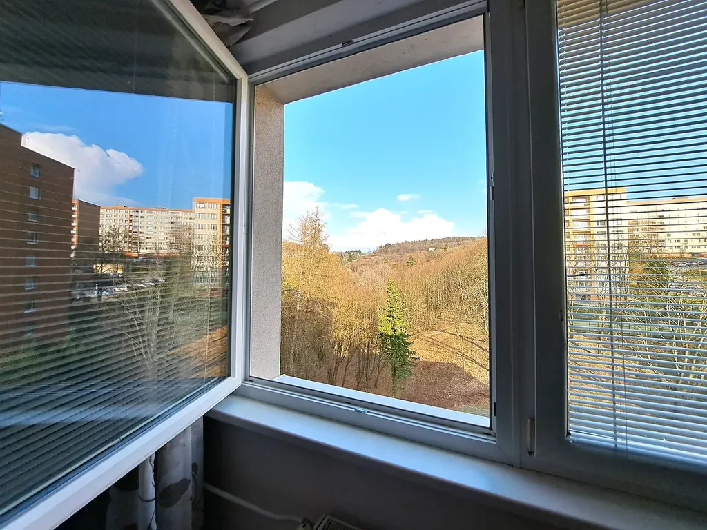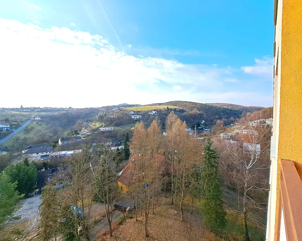 Dispoziční řešení bytu: prostorná vstupní chodba, šatna - vestavěné skříně, prostorný obývací pokoj, koupelna (vana se skleněnou sprchovou zástěnou, umyvadlo, pračka), samostatné WC, kuchyň s komorou a místem na jídelním kout, ložnice, pokoj, lodžie s krásným výhledem. K bytu náleží sklep. Velká výhoda tohoto bytu je, že pokoje jsou neprůchozí a dále úložné prostory v chodbě. V bytě jsou nová okna se žaluziemi, vstupní dveře, podlahy v kuchyni a chodbě - dlažba, koupelna je obložena i WC.