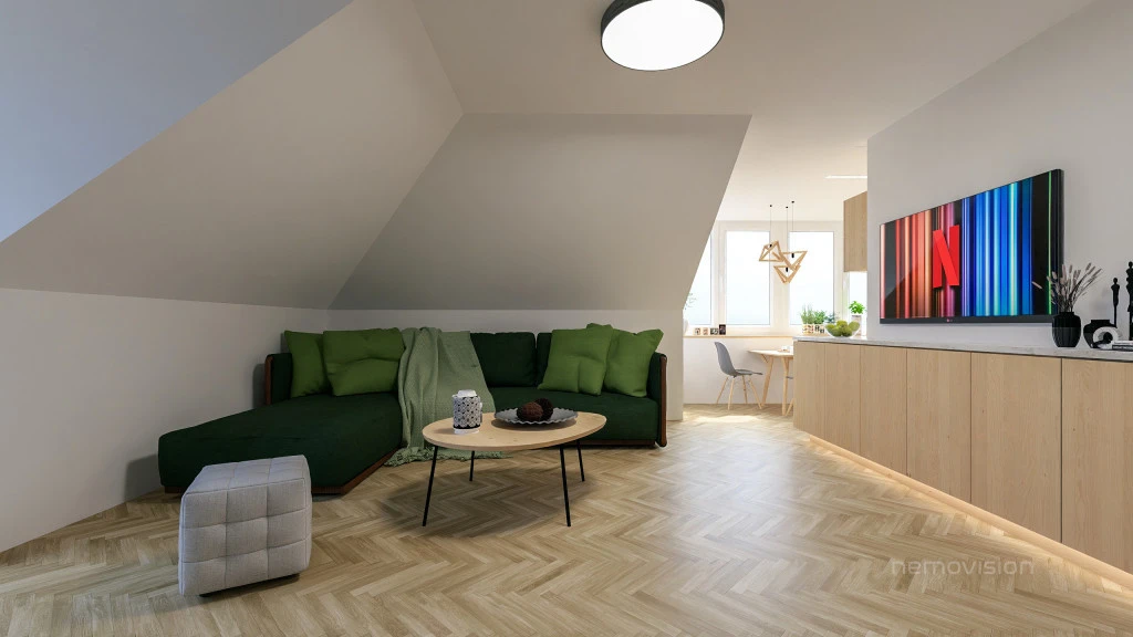 Byt by se nacházel v 5. nadzemním podlaží, vysoko nad ruchem města. Odměnou za pár schodů navíc je klid, soukromí a příjemná atmosféra bydlení pod střechou, která má své neopakovatelné kouzlo.