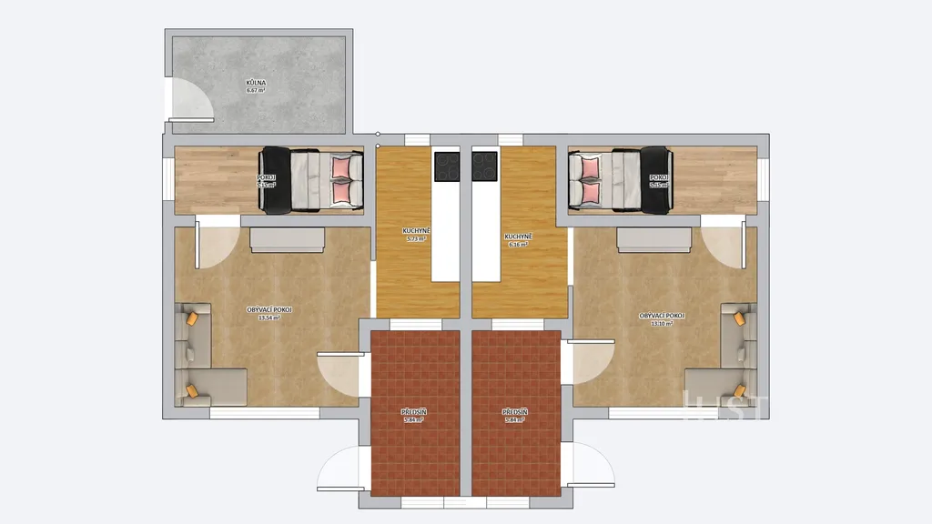 • obě poloviny jsou zrcadlově stejné, oddělení je řešeno sádrokartonovou příčkou a tvoří jeden funkční celek. Chatu tak mohou využívat například dvě rodiny nebo přátelé, kteří chtějí trávit čas společně, ale mít každý své zázemí