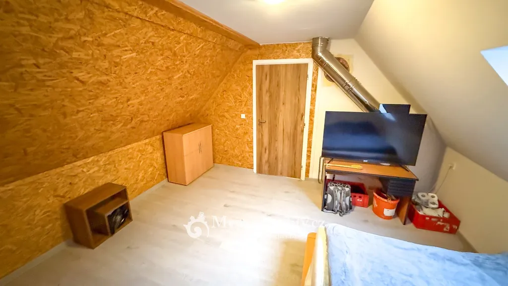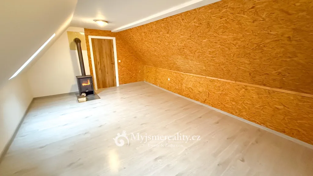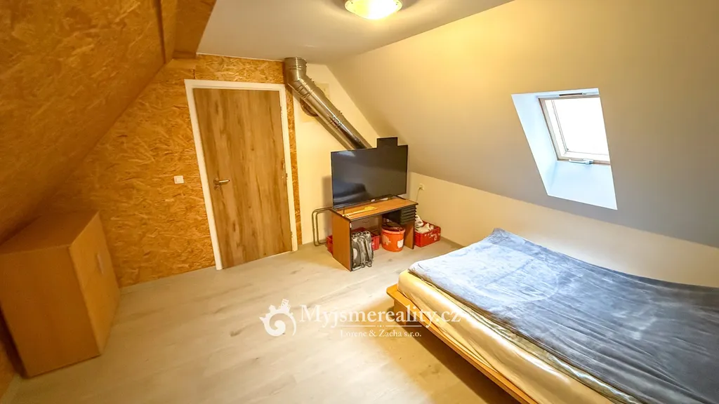 Součástí nemovitosti je podkrovní byt o dispozici 2+kk a výměře 65 m², který poskytuje příjemné a klidné bydlení přímo nad sklepem. Dispozice zahrnuje vstupní chodbu, samostatnou ložnici, světlý obývací pokoj s kuchyňským koutem, koupelnu se sprchovým koutem a samostatnou toaletu.