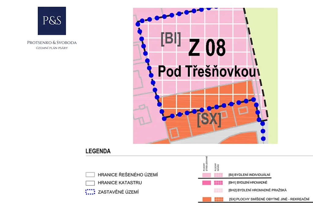Pozemek se nachází v území určeném pro bydlení individuální a rekreační ([SX] – plochy smíšené obytné jiné – rekreační), což dává široké možnosti využití – trvalé bydlení, rekreační dům nebo investiční projekt.