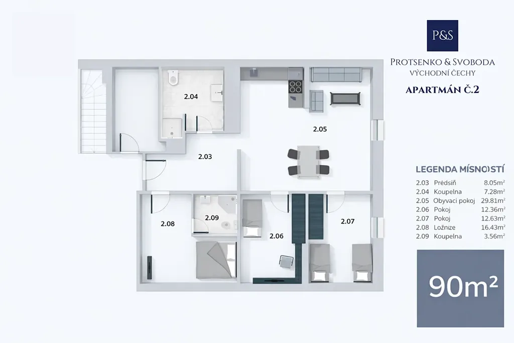• Apartmán 2 (2. NP, 4+kk, 93,95 m²) – ideální pro větší rodiny
