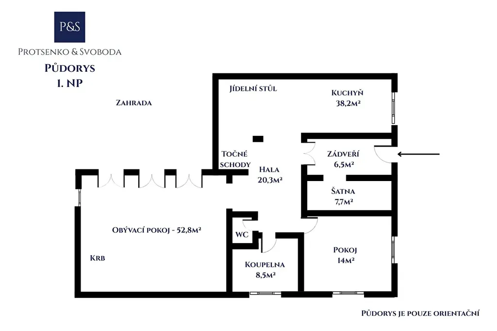 • Velkorysý obývací pokoj (~50 m²) s krbem a francouzskými okny do zahrady