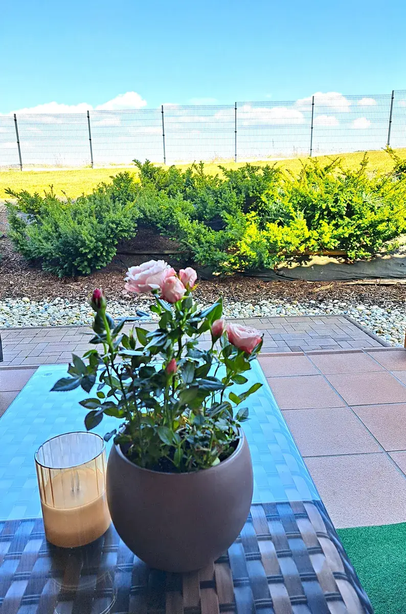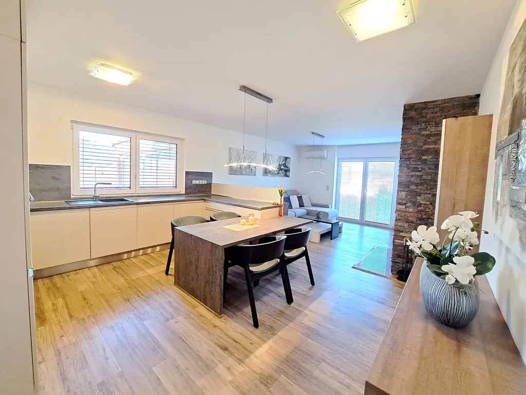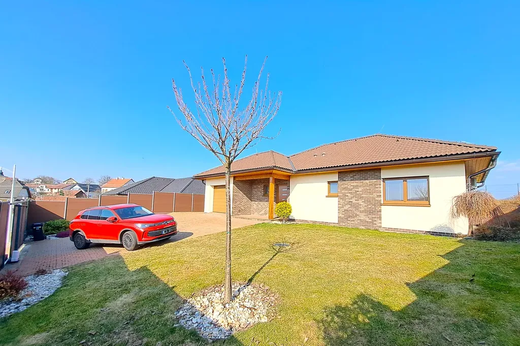 Dispoziční řešení domu: Zádveří, vstupní chodba, technická místnost, komora, kuchyň Sýkora s vestavěnými spotřebiči AEG , obývací pokoj s krbem a přímým vstupem do zahrady , pokoj-šatna se vstupem na prostornou terasu s příjemným posezením, ložnice, pokoj, koupelna ( umyvadlo, prostorným sprchový kout, infrasauna), samostatné WC s umyvadlem, garáž je opatřena sekčními vraty a přes technickou místnost se projde do domu. Vytápěná plocha domu je 120 m2.