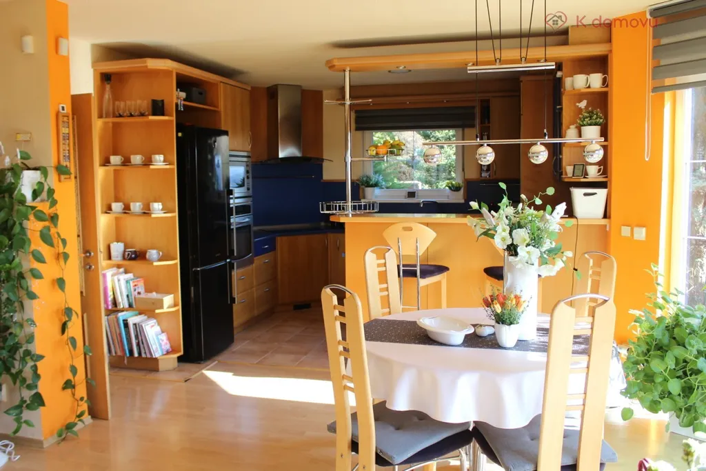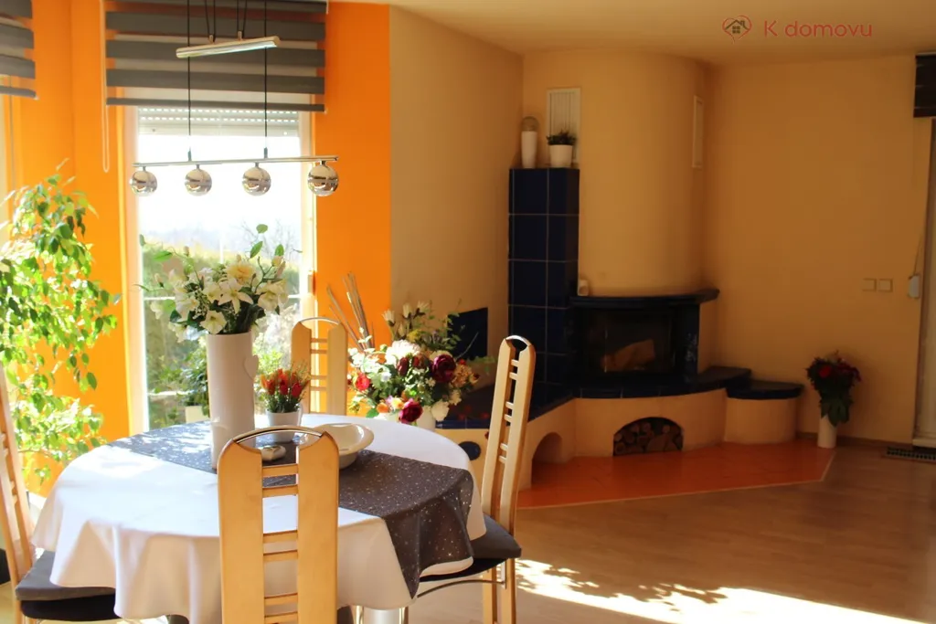 Srdcem domu je velkorysý obývací pokoj propojený s jídelnou o ploše 44 m², kde je dostatek místa pro rodinná setkání i posezení s přáteli. Příjemnou atmosféru zde vytvářejí kachlová kamna, která dodávají prostoru teplo i útulnost. Na obytnou část navazuje kuchyně a vstup na terasu s výhledem do zahrady.