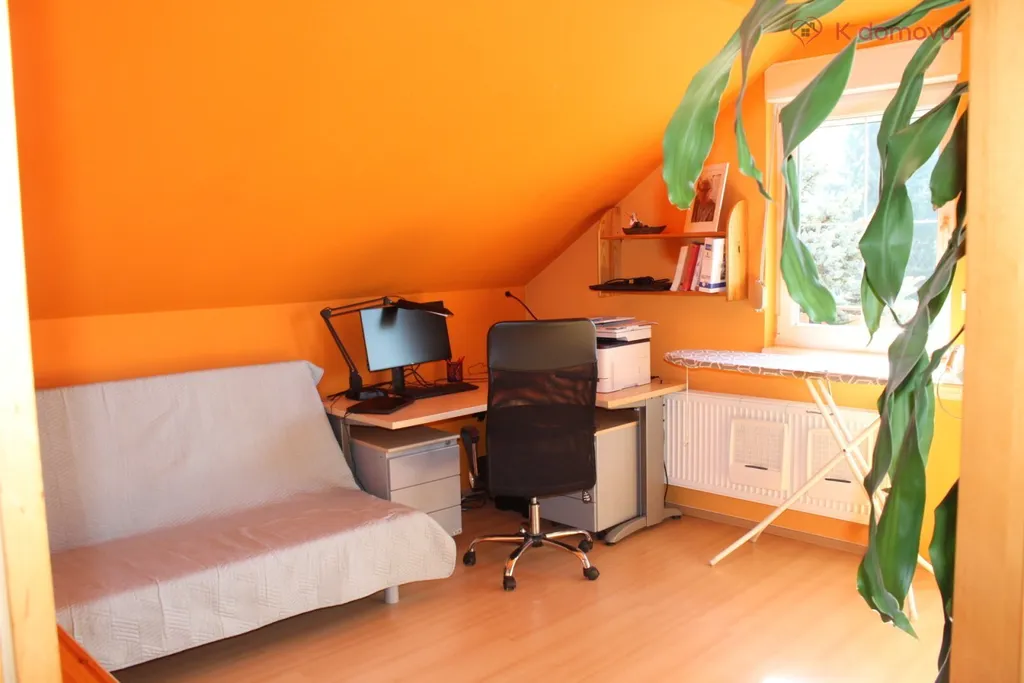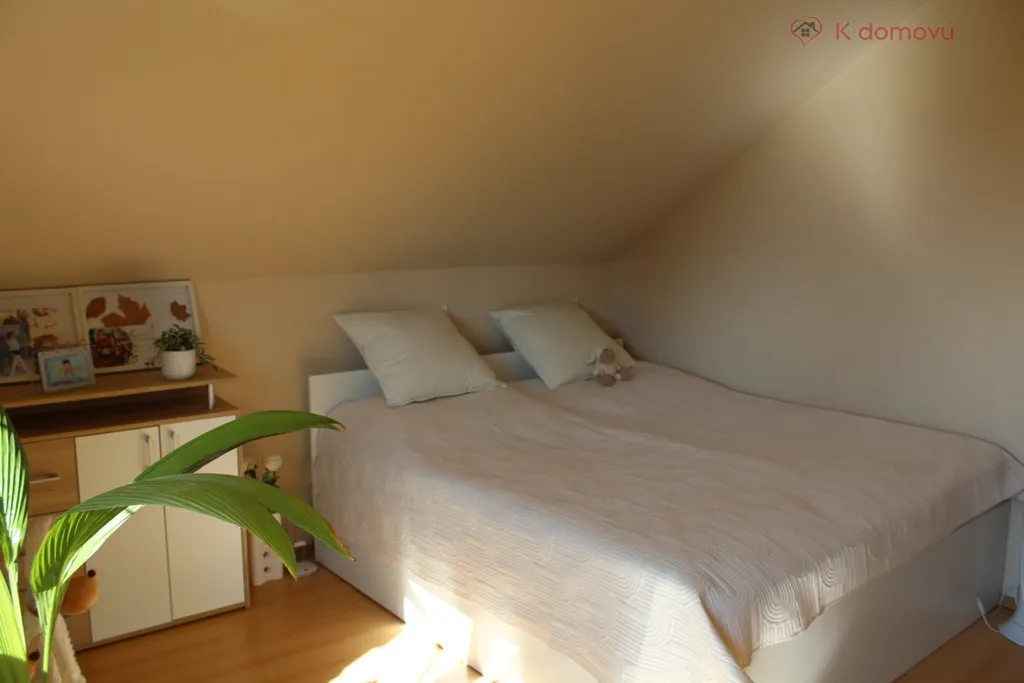 V patře domu najdete prostornou ložnici, další světlý pokoj s balkonem a krásným výhledem do okolní krajiny, koupelnu a místnost vhodnou jako pracovna nebo dětský pokoj.