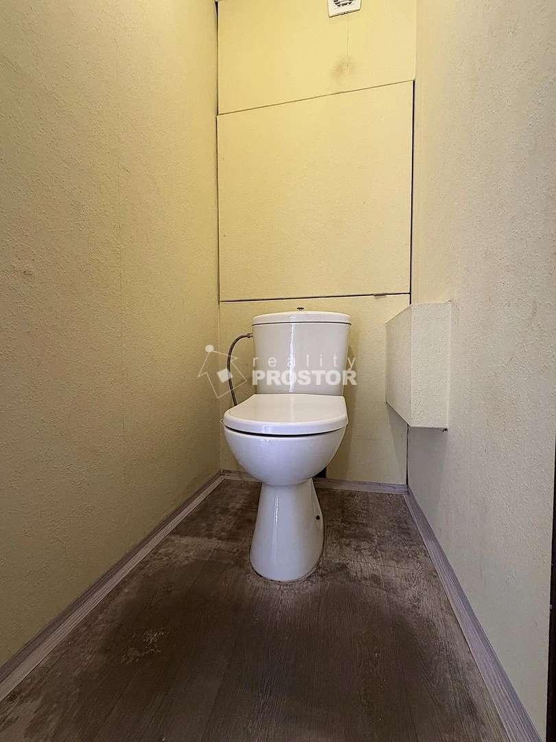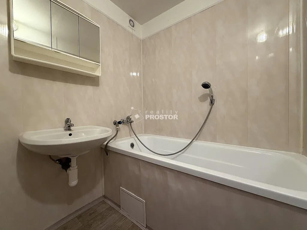 Koupelna je obložena modernějším obkladem, bytové jádro je však původní umakartové. Na podlahách je položeno moderní lino v dekoru dřeva, které designově ladí s dveřmi do jednotlivých místností.