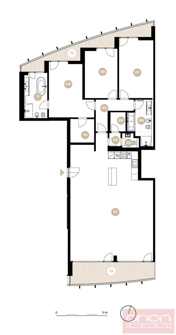 Moderní, luxusní byt 4+kk s dvěma terasami v Rezidenci Ellipsis s 24/7 recepcí, výtahem, podzemní garáží, wellness - bazén, sauna, a rozlehlou zahradou s parkovou úpravou v lokalitě Praha 5 - Smíchov s výborným spojením do centra, do nákupního centra Nový Smíchov, do Německé a Francouzské školy. Byt je ve 4. patře, má plochu 178,35 m2 + terasy 29,47 m2, nabízí halu, prostorný obývací pokoj otevřený s jídelnou a plně vybavenou kuchyní (66,5m2m2) a se vstupem na terasu o velikosti 16,07 m2 s krásným výhledem, 3 ložnice, které mají přímý vstup na terasu o velikosti 13,40 m2, 2 koupelny s vanou, sprchou, toaletou, bidetem (jedna koupelna je přístupná z ložnice), samostatnou toaletu, chodbu a prádelnu. Kvalitní materiály, dřevěné podlahy, velkoformátová dlažba, francouzská okna, bezpečnostní dveře, internet. Sklep. Možnost nájmu garážové stání za poplatek 200 EUR+ DPH/ měsíc. Oblíbená lokalita Praha 5 - Smíchov s dobrým dopravním spojením, v pěší vzdálenosti na stanici metra a tramvaje Anděl, do parku Petřínské sady. NÁJEM 3.800 Euro/měsíc je splatný v eurech. Členský poplatek za wellness 2.500 Kč/měsíc. V přízemí budovy se rovněž nachází fitness centrum Prisma Institut, které je ideálním pro aktivní odpočinek.