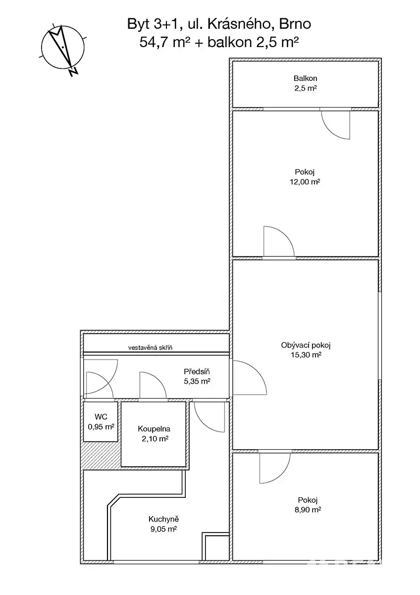 Nabízíme ke koupi byt v osobním vlastnictví o dispozici 3+1, který je umístěný ve 4. patře panelového bytového domu s výtahem na ul. Krásného v Brně - Juliánově v blízkosti lesoparku Bílá hora. Celková podlahová plocha bytu včetně příslušenství činí 54,7 m2 + balkon 2,5 m2. K bytu náleží sklepní box a dále je možné využívat společnou kolárnu a sušárnu v přízemí domu.