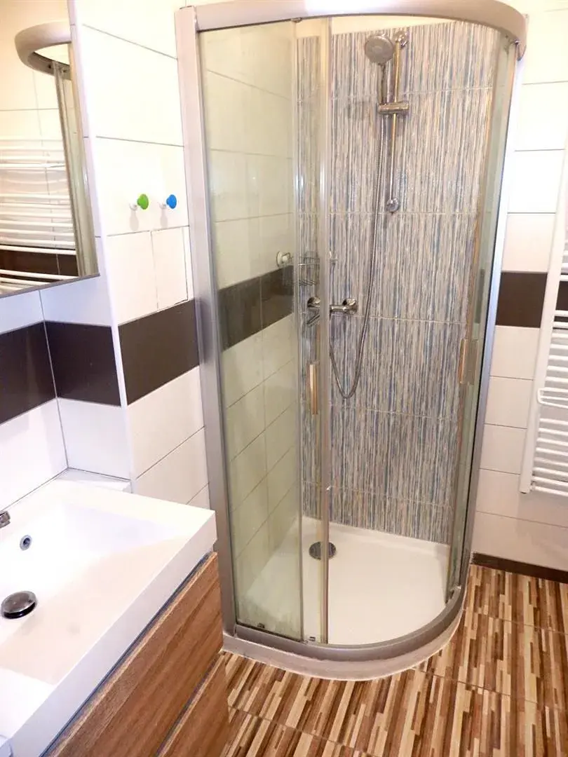 Obývací pokoj je průchozí s ložnicí ( 12,7 m2 ), ve které je umístěna manželská postel se dvěma nočními stolky a prostorná šatní skříň. V předsíni je k dispozici další vestavěná skříň, botník a věšák na kolo. Naproti vstupu do bytu se nachází koupelna ( 3,9 m2 ) se sprchovým koutem, umývadlem a pračkou se sušičkou, nad kterou je umístěn elektrický bojler ( 120 l ). Z předsíně se ještě vstupuje do samostatné toalety ( 1,5 m2 ), která je umístěna vpravo od vstupu do bytu, vedle koupelny.