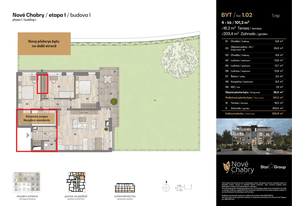 Moderní 4+kk s terasou 16,2 m² a zahradou 203,4 m² – nastěhování již letos.