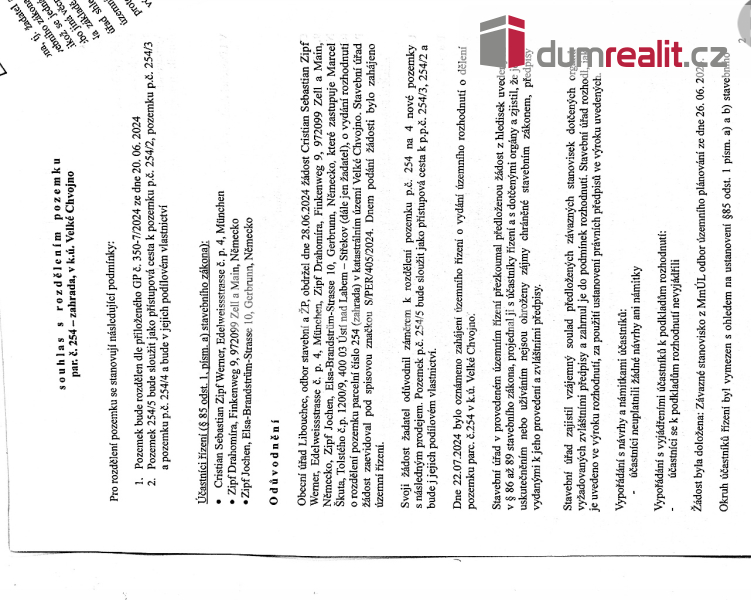 255/4 každý o výměře 700 m² v krásném prostředí obce Velkého Chvojna. Stavební povolení pro rozdělení pozemků na čtyři parcely mame schválené jak stavebním úřadem tak i krajským rozvojovým úřadem tudíž nebrání nic k výstavbě rodinných domu a je již zapsáno v katastru nemovitostí. Ten to pozemek je ideální pro výstavbu rodinného domů, který můžou mít dvě nadzemní podlaží a podkroví.