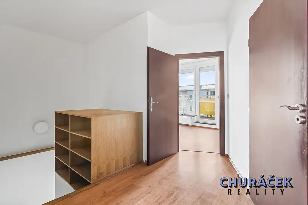 Byt je prakticky řešený jako mezonet, což přirozeně odděluje obytnou a klidovou část. Ve spodním patře se nachází prostorný obývací pokoj s kuchyňským koutem, vybaveným moderními spotřebiči, dále koupelna se sprchovým koutem a samostatná toaleta.
