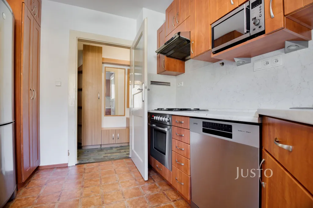 Byt je částečně vybavený a jeho součástí je prostorná kuchyně s jídelním stolem, myčkou, lednicí, troubou, mikrovlnkou a plynovou varnou deskou. V koupelně je k dispozici vana s toaletou. Úložné prostory zajišťují vestavěné skříně. Byt má plastová okna a lokální plynové topení s radiátory, zdroj teplé vody i vytápění je řešen plynovým kondenzačním kotlem.