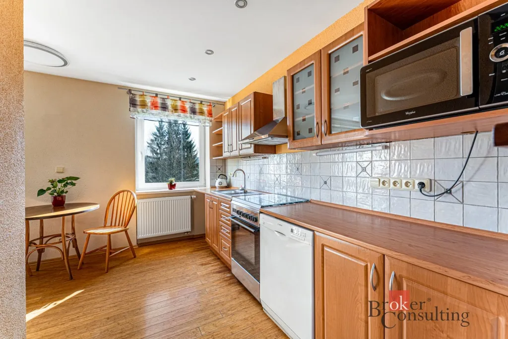 Dominantou bytu jeobývací pokoj propojený s kuchyní, kde se nachází stylovákachlová kamna, která vytváří útulnou atmosféru. Z obývací části je vstup nabalkona zároveň odtud vedou dveře doložnice s dalším balkonema také dodětského pokoje.