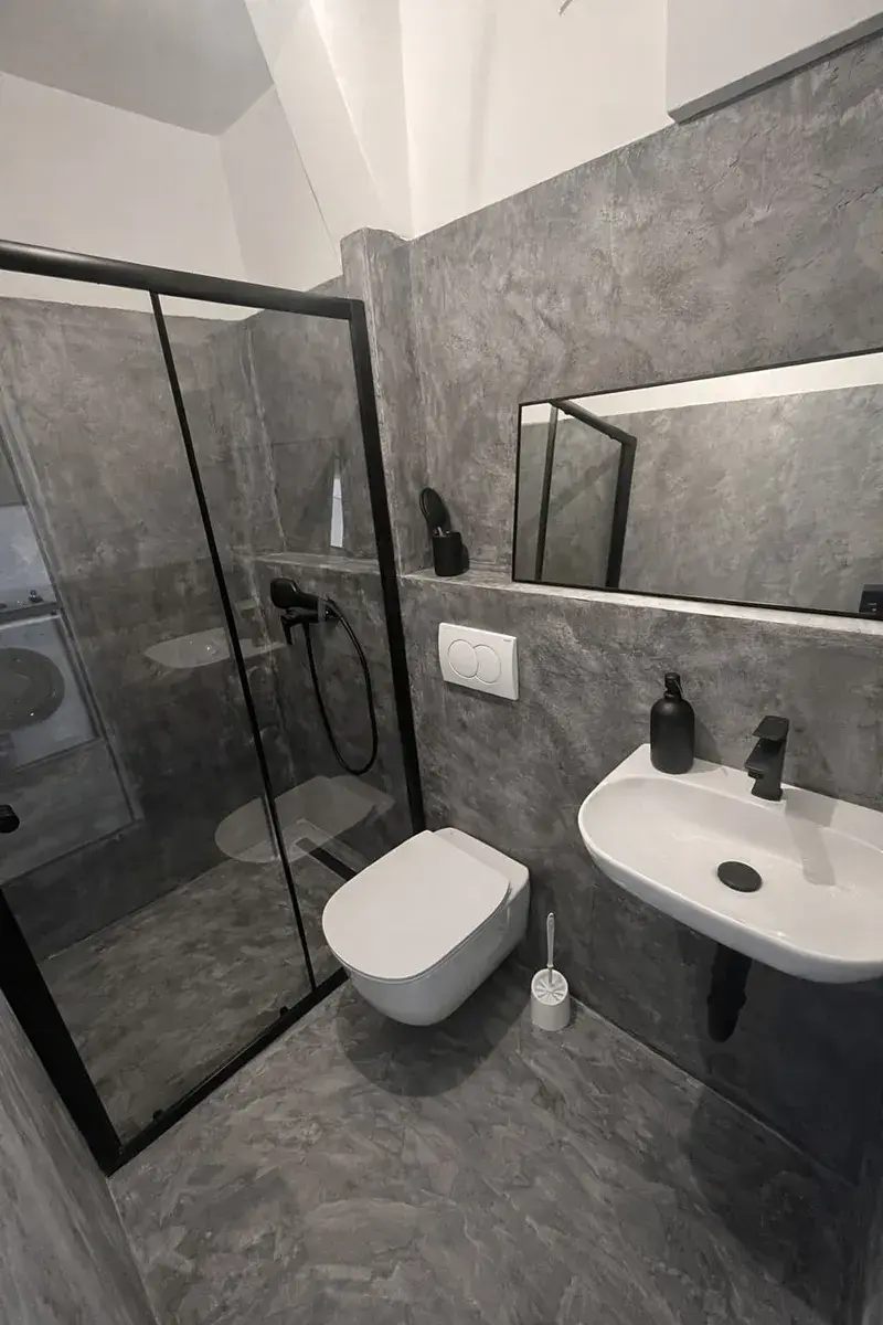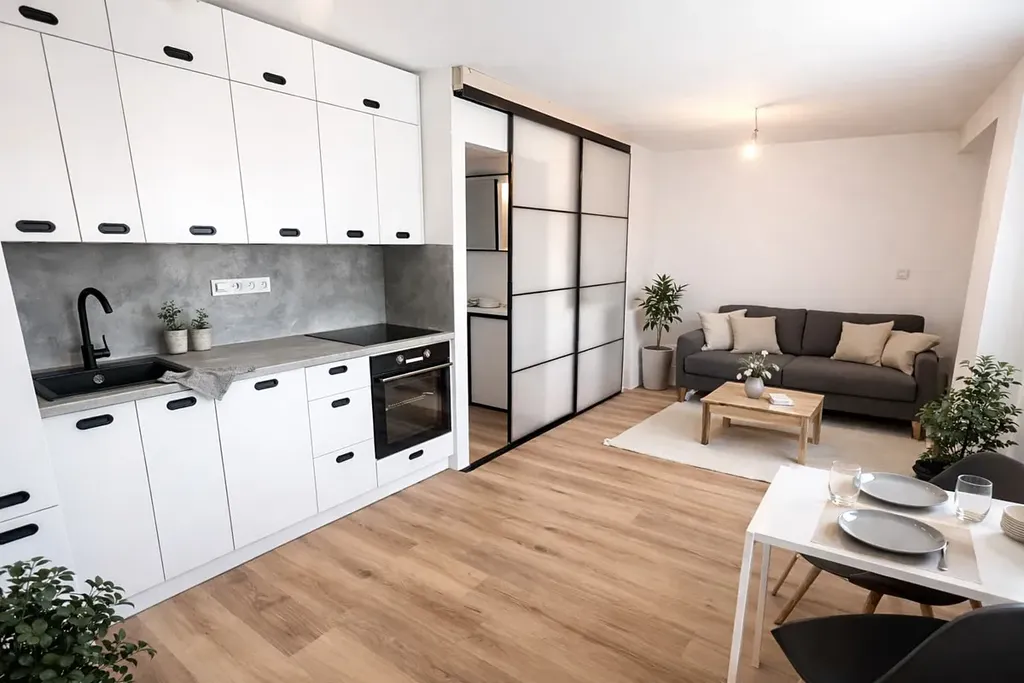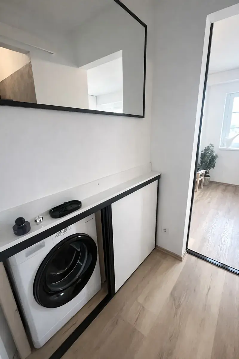 Byt je tvořen hlavním obytným prostorem s moderní kuchyňskou linkou vybavenou spotřebiči, jídelním koutem a obývací částí. Praktickým prvkem je oddělená spací zóna s vyvýšeným lůžkem a úložnými prostory, která je částečně oddělena posuvnou stěnou, což zajišťuje větší soukromí a funkční využití prostoru. V bytě se dále nachází vestavěné skříně, dostatek úložných míst a pračka. Koupelna je moderně řešená a nabízí sprchový kout, toaletu a umyvadlo.