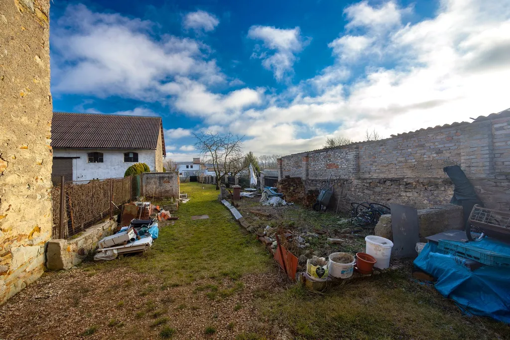 Celková plocha parcel 823 m². Napojení na všechny obecní sítě — plyn, voda, kanalizace, elektřina. Centrální plynový kotel. Zahrada využívaná nájemníky. Vjezd na pozemek.