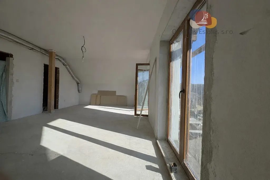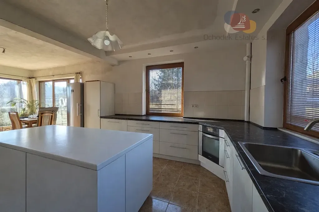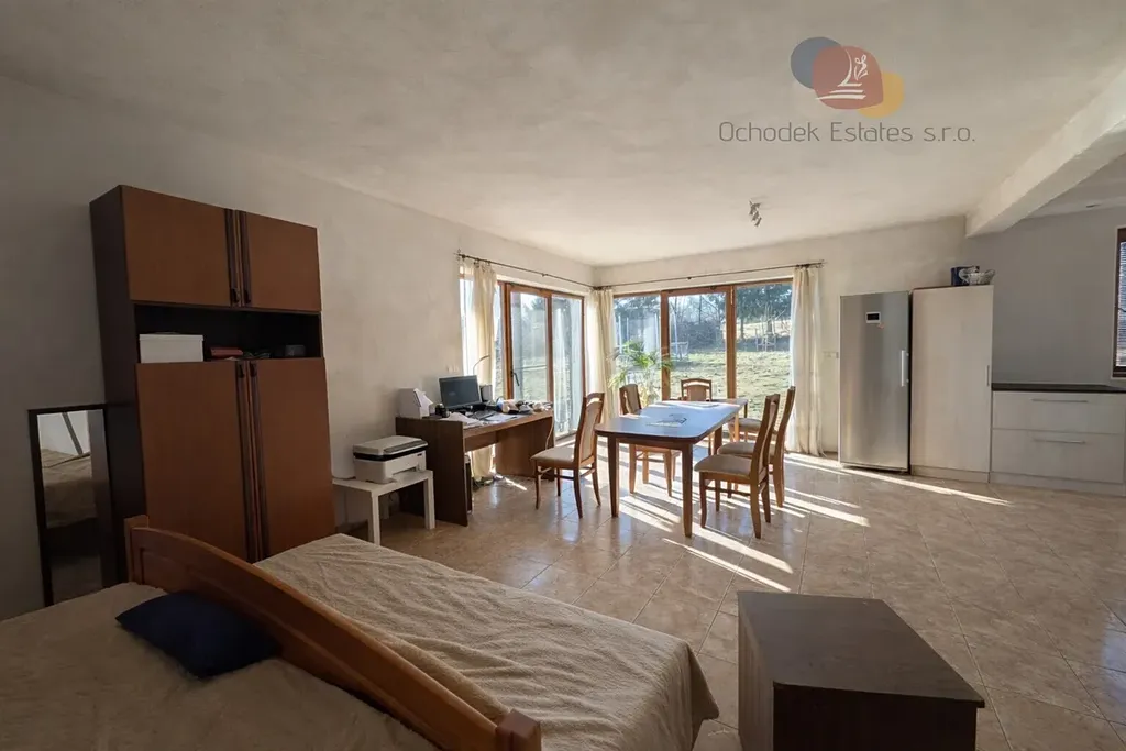 Na pozemku se nachází dvoupodlažní rodinný dům o podlahové ploše cca 162 m2, jehož druhé podlaží čeká na dokončení. V prvním podlaží najdeme obývací místnost propojenou s prostornou kuchyní a samostatnou koupelnu.
