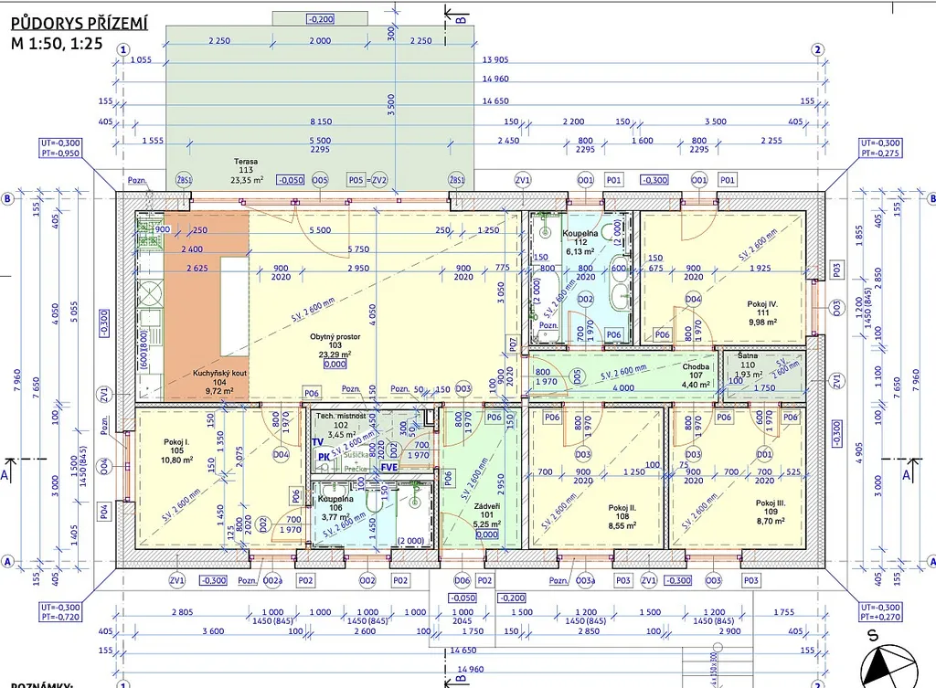 Obývací pokoj je přirozeně propojen s kuchyní, pro kterou je zde vyhrazen dostatečný prostor pro umístění kuchyňské linky i jídelního stolu. Tento otevřený obytný prostor působí vzdušně a světle a stává se skutečným centrem rodinného života. Z obývací části je přímý vstup do hlavní ložnice s vlastní koupelnou, dále výstup na plánovanou nekrytou terasu o velikosti 23,35 m², která zatím není vybudována a nabízí tak možnost realizace dle vlastních představ, s krásným výhledem do zahrady. Současně je zde vstup do chodby vedoucí do klidové části domu, kde se nacházejí tři další pokoje, z nichž jeden disponuje samostatnou šatnou, a dále druhá plnohodnotná koupelna vybavená vanou, sprchovým koutem, dvojumyvadlem a WC. Celková dispozice domu je navržena tak, aby jasně oddělovala denní a klidovou část a poskytovala dostatek soukromí i pohodlí pro každého člena domácnosti.