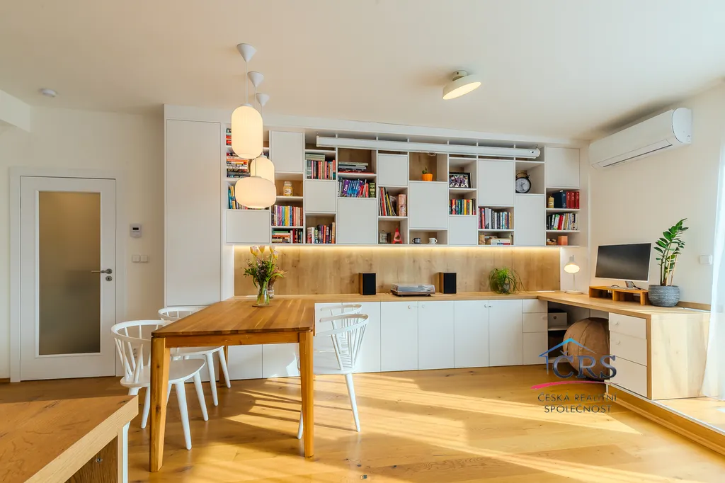 Byt nabízí dostatek úložného prostoru, vše řešené vestavěným nábytkem na míru. Komfort bydlení zvyšuje klimatizační jednotka v obývacím pokoji.