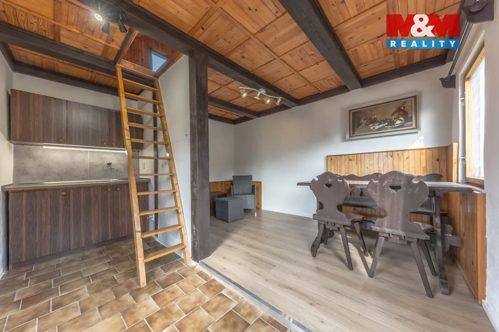Podkroví – přístup po schodech, nově upravené dřevěné prvky, prostor pro občasné přespání.