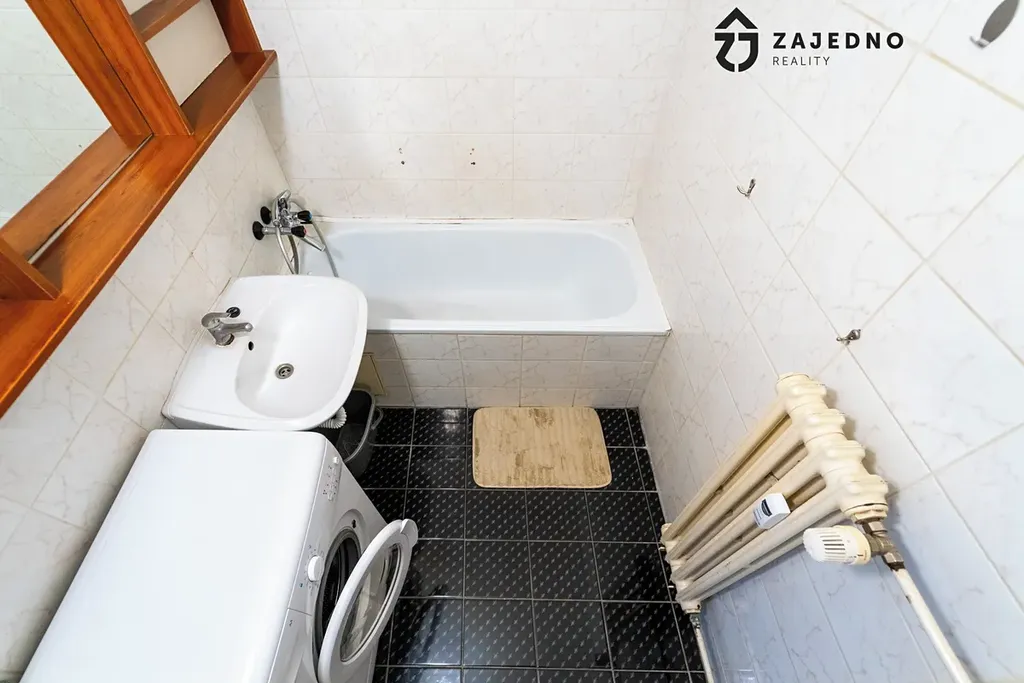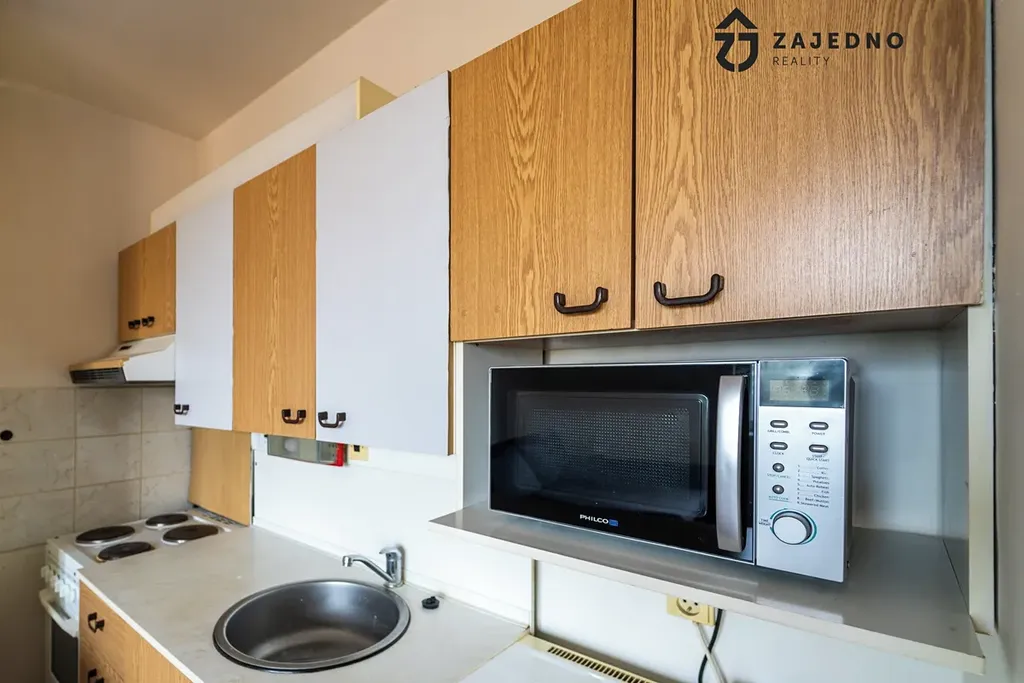 Dispozice bytu zahrnuje obytný prostor s kuchyňským koutem, koupelnu a samostatné WC, což zvyšuje komfort bydlení.