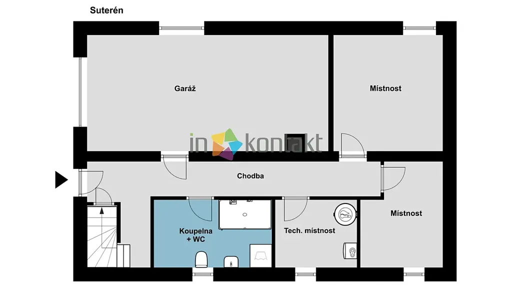 • Suterén (Technické a užitné zázemí): Zahrnuje prostornou garáž s elektrickými vraty na dálkové ovládání, technickou místnost (s přípravou pro osazení elektrokotle či tepelného čerpadla) a další dvě využitelné místnosti. Nachází se zde také příprava pro druhou koupelnu, do které ústí zmíněný shoz na prádlo z vrchního patra.
