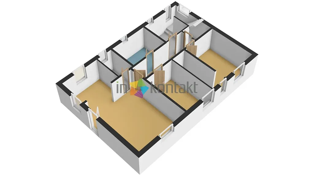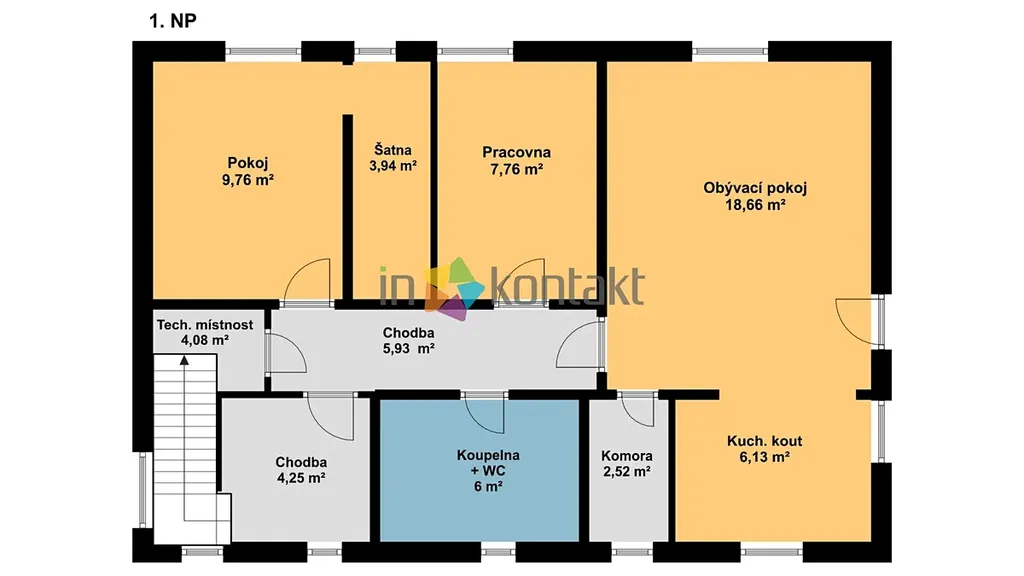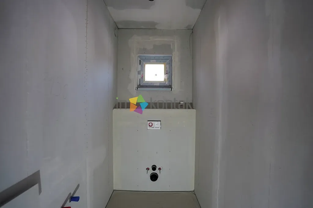 • 1. NP (Hlavní obytné patro): Srdcem domu je prostorný obývací pokoj s kuchyňským koutem, kde je již připraven vývod v komíně pro budoucí krbová kamna. Dále se zde nachází ložnice se šatním koutem, dětský pokoj (či pracovna), komora a koupelna s WC. V koupelně je připraveno napojení pro vanu, sprchový kout a velmi praktický shoz na prádlo přímo do suterénu. V celém tomto patře je již rozvedeno teplovodní podlahové vytápění a je zde nachystána kabeláž pro případnou instalaci klimatizace.