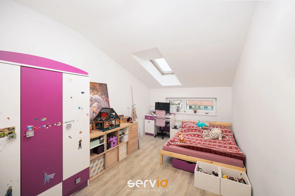 Jedná se o patrový dům o 2.NP v blokové zástavbě rodinných domů mimo hlavní ulici. V přízemí se nachází obývací pokoj s kuchyňským koutem, vstupem na zahradu s terasou, pracovna a WC. V patře zbývající 4 pokoje a koupelna s vanou a WC. Možnost parkovaní na vlastním pozemku až pro 3 auta, z toho 1 kryté za uzamykatelnou bránou.