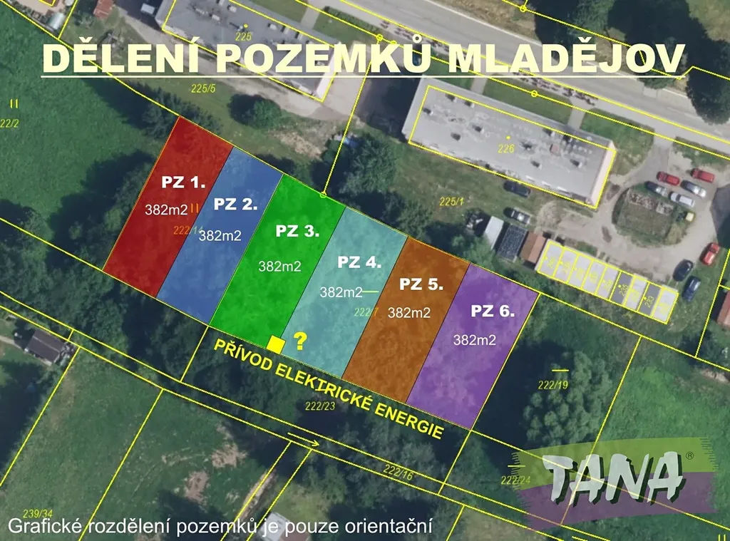Nabízíme Vám tímto možnost odkoupit podíl 1/6 pozemku každý o výměře 382m2 nacházejících se na okraji obce Mladějov Českém ráji (Sobotka cca 5km, Jičín cca 10km). Pozemek je dle platného ÚP určen pro jako SV – Plochy smíšené obytné – venkovské . Je zde tedy možno postavit si například zahradní domek. Aktuálně je na ČEZ podána žádost o připojení a zavedení jedné centrální přípojky elektrické energie, která bude po instalaci sloužit podružným měřením společně všem spoluvlastníkům. Přístup k jednotlivým parcelám individuálně z pozemků pod bytovkami.