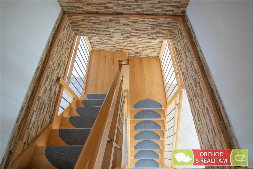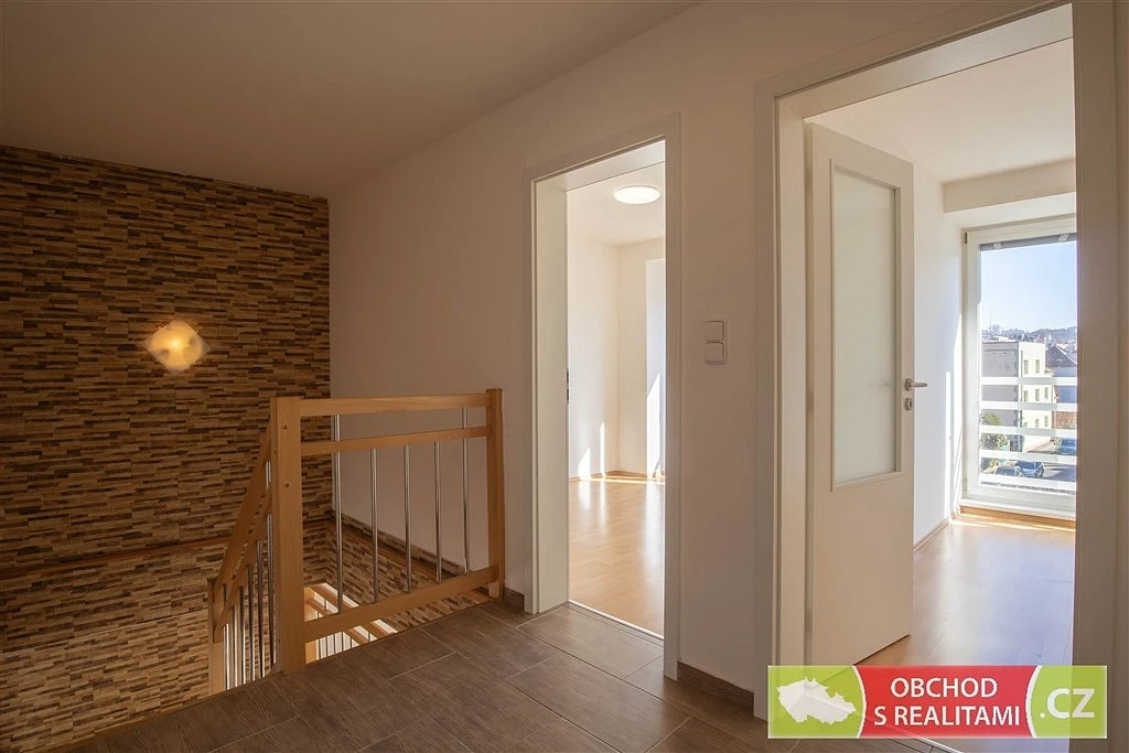 Po dřevěném schodišti, které je umístěné uprostřed obývacího pokoje, se dostanete do druhého podlaží bytu a zde je velká koupelna s rohovou vanou a tři ložnice. Byt je velmi slunný, má velkoformátová okna na dvě světové strany; obývací pokoj, balkon, pracovna a dvě ložnice jsou na východ; kuchyně, část obývacího pokoje a jedna z ložnic jsou na západ. Dispoziční plánek je součástí fotodokumentace včetně všech výměr.